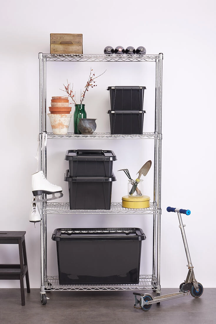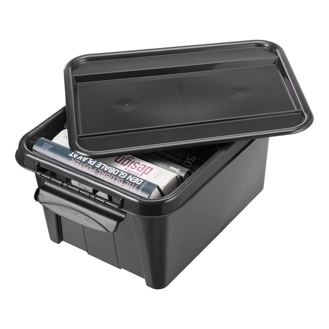 Houd orde met deze duurzame opbergbox van gerecycled polypropyleen. Dankzij het volume van 32 liter en de afmetingen 51 × 39 × 25,8 cm biedt hij plaats aan kleine tot middelgrote voorwerpen. Het stevige deksel en 2 robuuste clips zorgen voor een veilige afsluiting en bescherming van de inhoud tegen stof.