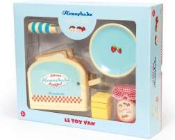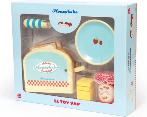 De houten Honeybake-set van LE TOY VAN tovert de kinderspeelhoek om tot een knusse keuken. Kinderen zullen dol zijn op de realistische broodrooster met veer, waaruit na het indrukken twee sneetjes “toast” omhoog springen. De boter met klittenbandsluiting leert de juiste greep en het werken met het mesje, terwijl het potje aardbeienjam en het bordje elke speelse ontbijtbereiding compleet maken.