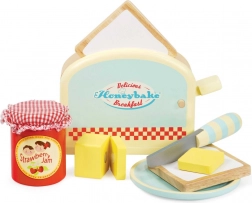 • Complete ontbijtset: broodrooster met veer, 2 sneetjes brood, boter met klittenband, mes, bord en jam.