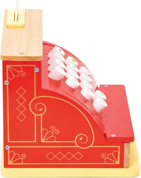 De vrolijke rode kleur met gouden accenten en de grote knoppen maken van deze kassa een aantrekkelijke blikvanger voor elke kinderwinkel.