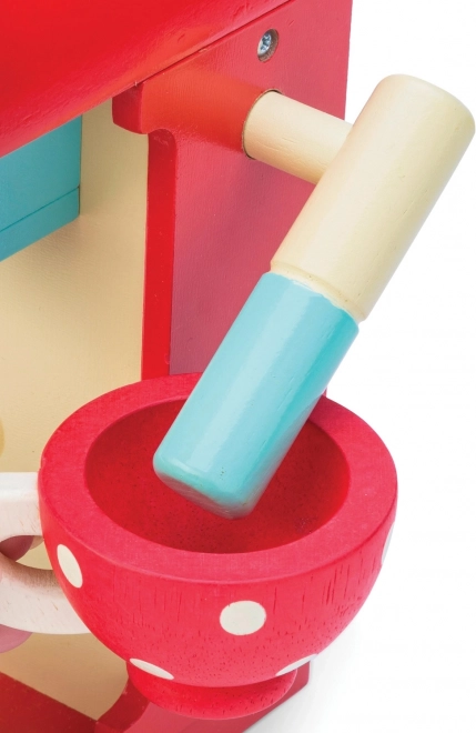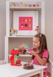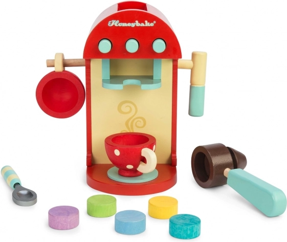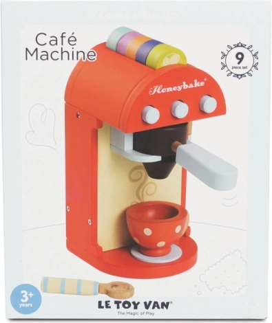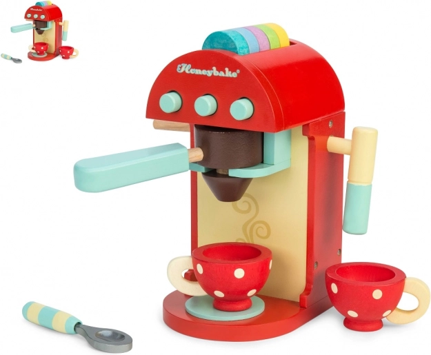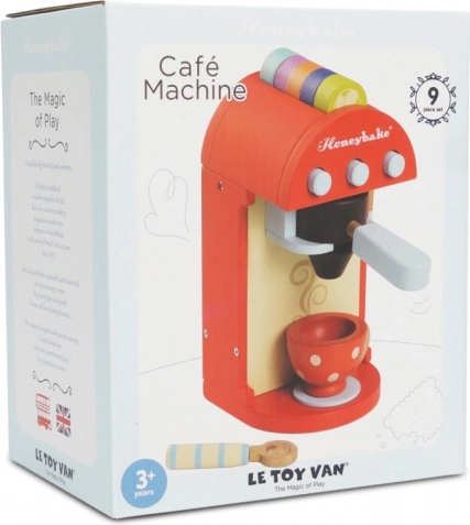 Deze kwalitatieve houten koffiemachine biedt kinderen een authentieke koffie-ervaring. Gekleurde capsules kunnen in de hendel worden geplaatst en drank kan “gezet” worden rechtstreeks in het beschilderde kopje; er is ook een melkopschuimer en een lepeltje. De capsules kunnen handig worden opgeborgen in de opening aan de bovenkant van de machine, zodat alles binnen handbereik is.
