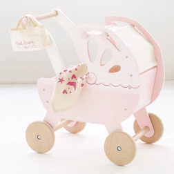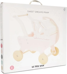 Stijlvolle houten poppenwagen Sweet Dreams van LE TOY VAN in pastelroze, met een traditionele uitstraling en hoogwaardige afwerking. Biedt een stevige constructie, een zacht matras, een met de hand genaaide uitschuifbare hemel en stille rubberen wielen voor soepel rijden op zowel tapijt als harde vloeren. Inclusief een schattige luiertas. Ethisch geproduceerd van FSC-hout en geverfd met niet-giftige verf.