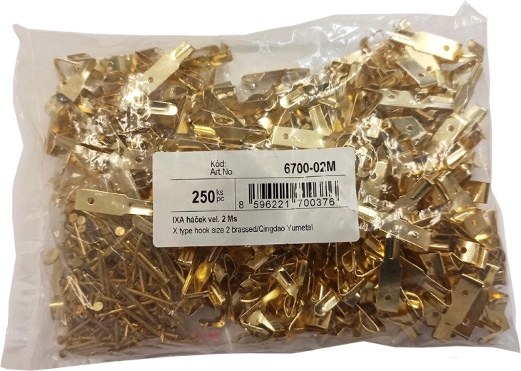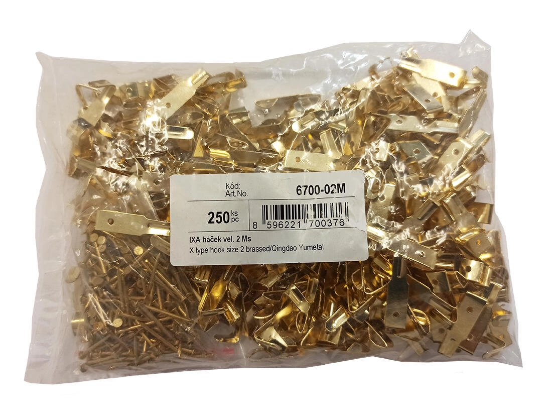 Praktische en duurzame metalen IXA-muurhaak in maat 2, ideaal voor snel en netjes ophangen van kleine voorwerpen in huis, op kantoor en in de werkplaats. De messingcoating geeft een elegante uitstraling en verhoogt de slijtvastheid. In de verpakking zitten 250 haken inclusief messinggecoate spijkertjes voor eenvoudige installatie op diverse ondergronden.