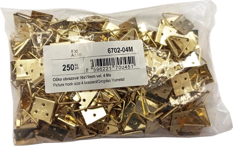Praktisch beeldoog voor betrouwbaar ophangen van lijsten en foto’s. Afmeting 16 × 15 mm, maat 4, uitgevoerd in messing voor een lange levensduur en een elegante uitstraling. Verpakking van 250 stuks is ideaal voor werkplaatsen, lijstenmakers en thuisgebruik. Eenvoudige montage door vast te slaan aan de achterzijde van een houten lijst.