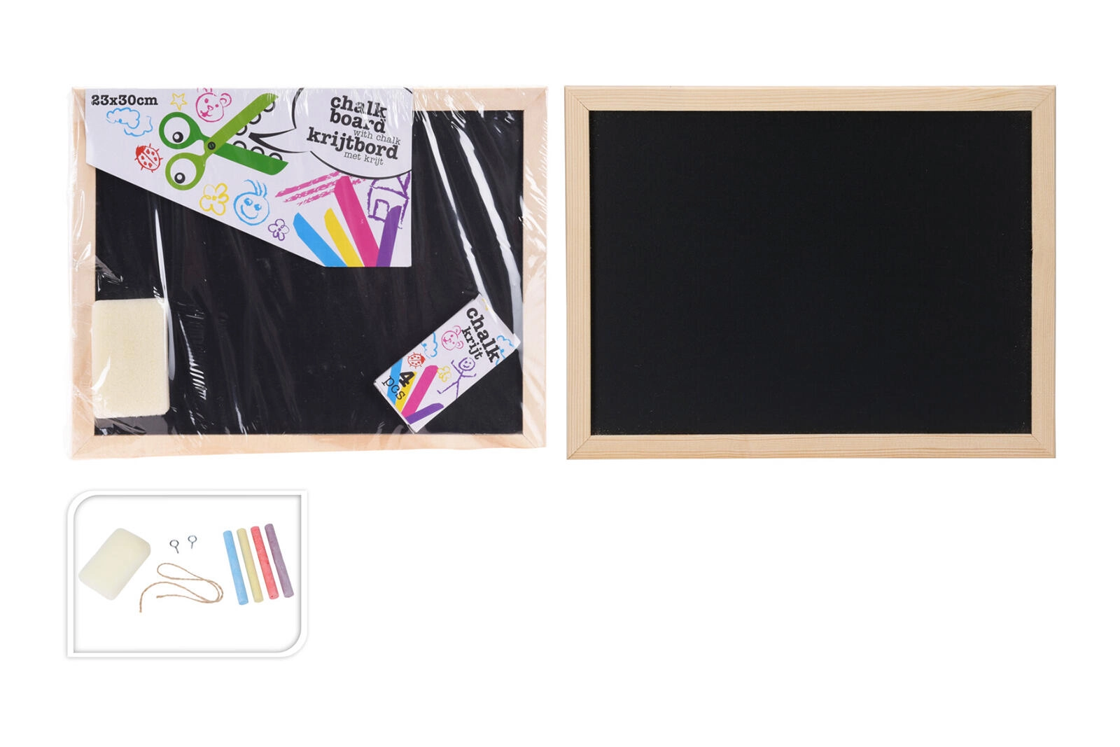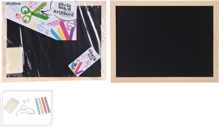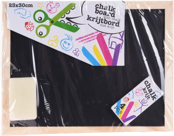 Praktisch zwart krijtbord voor kinderen om op te tekenen en schrijven, formaat 30 × 23 cm, omlijst met een rand van grenenhout. In de verpakking zitten gekleurde krijtjes en een spons voor schoonmaken voor direct gebruik. Ideaal voor thuis leren, creatief maken en plezier.