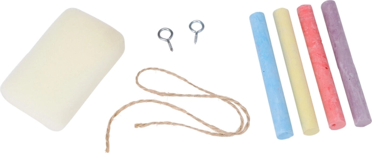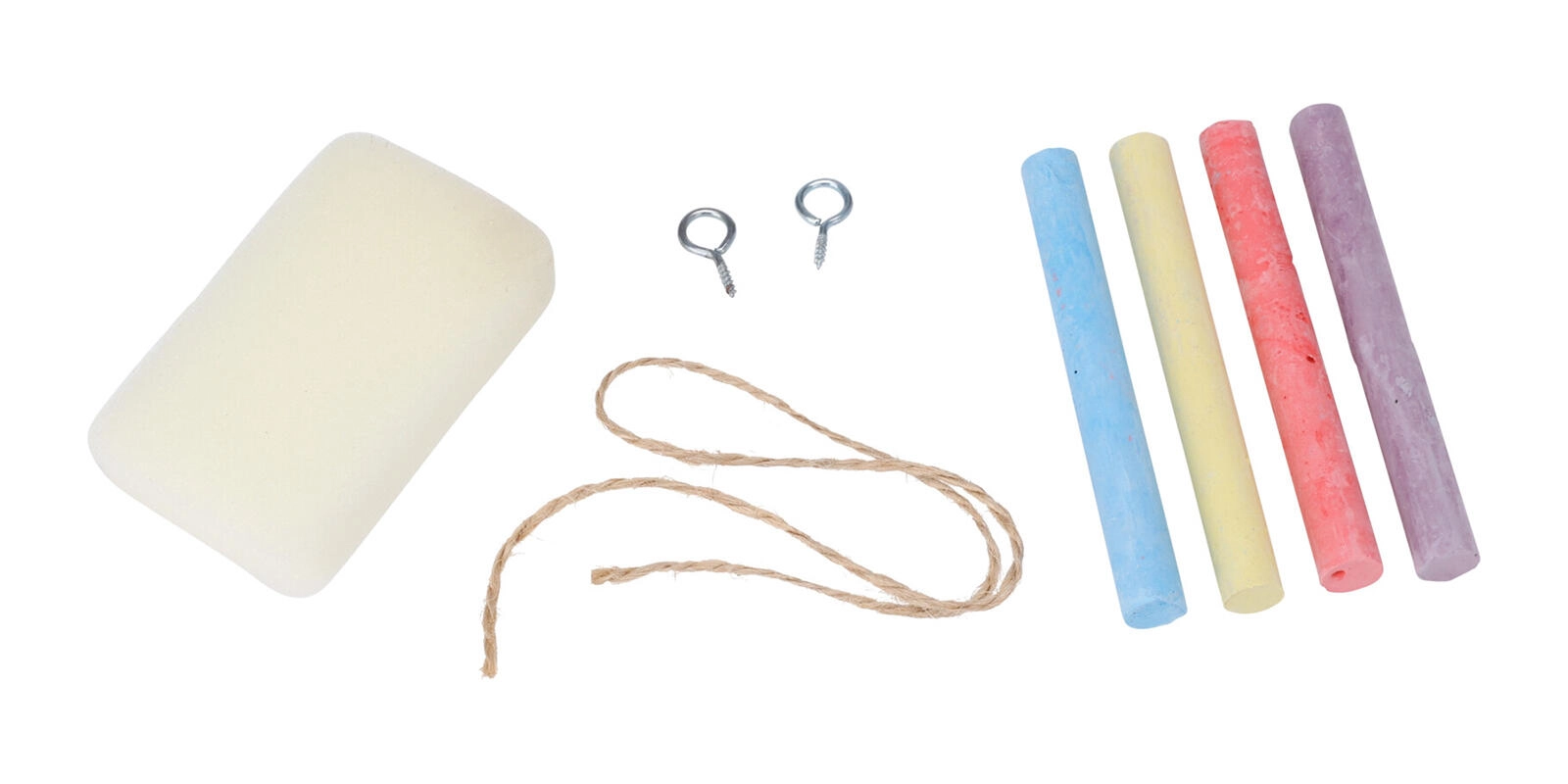 De set bevat 4 gekleurde krijtjes (geel, rood, paars, blauw) en een spons voor eenvoudig wissen, zodat je direct na het uitpakken kunt schrijven en tekenen. Het bordoppervlak zorgt voor soepel schrijven en makkelijk schoonmaken.