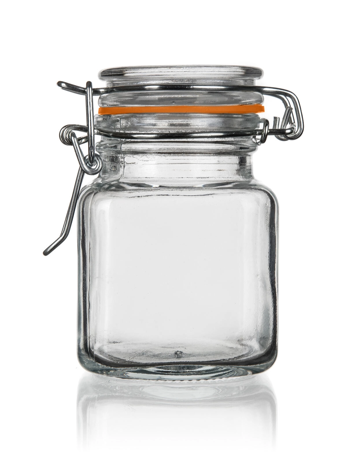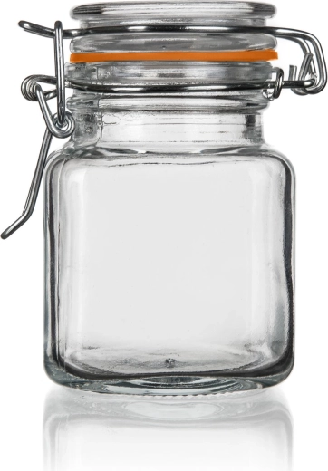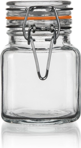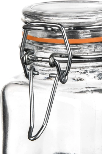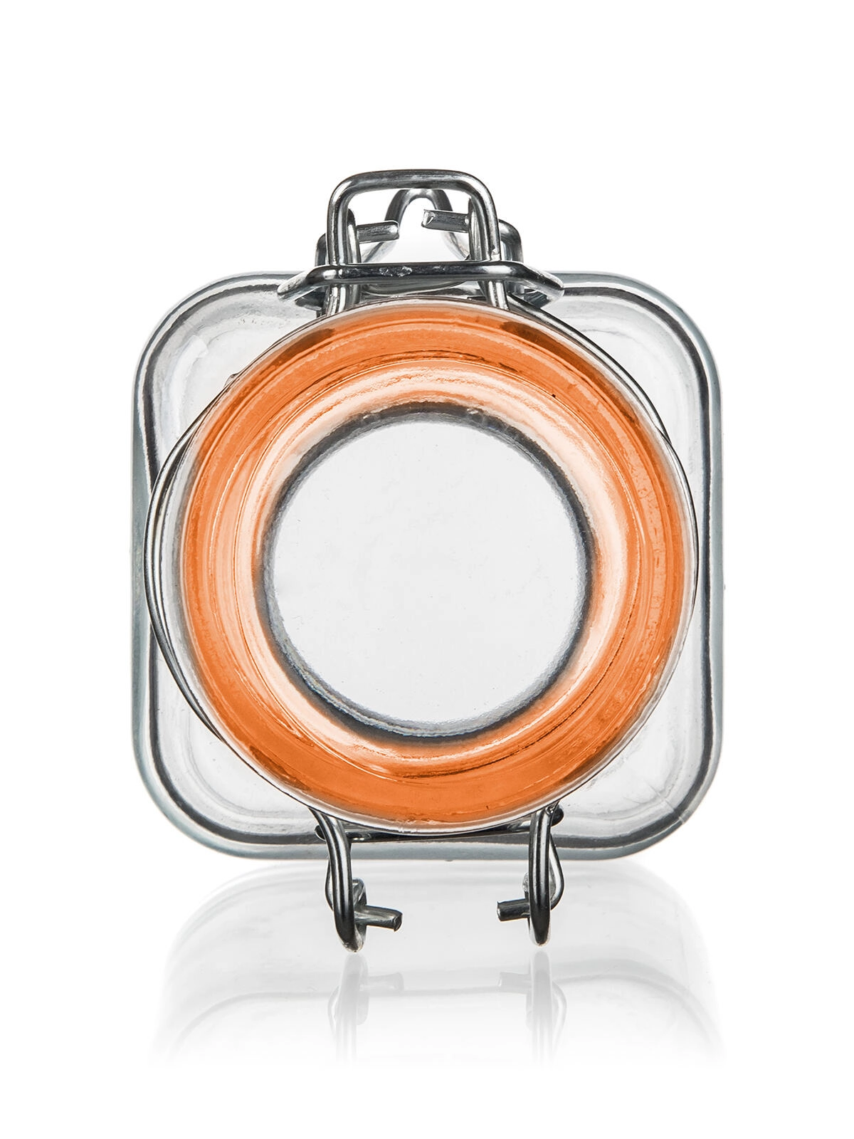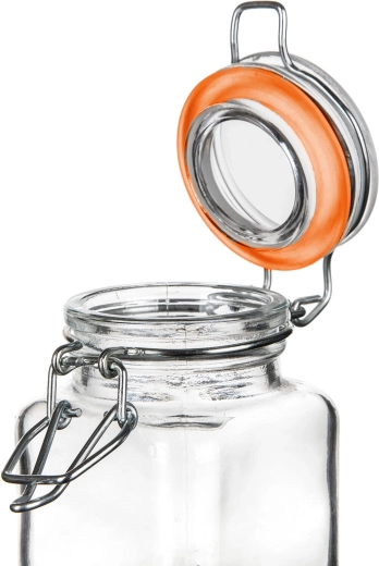 De metalen beugelsluiting met oranje siliconen afdichting zorgt voor een luchtdichte afsluiting die het aroma van kruiden behoudt en de inhoud beschermt tegen vocht.