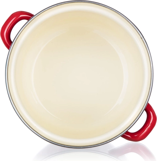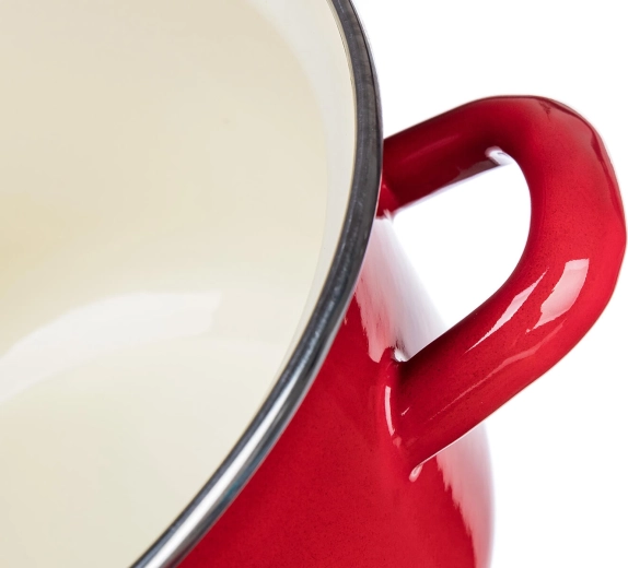 Rode email aan de buitenkant en een crèmekleurig interieur weerstaan vlekken en maken het onderhoud gemakkelijk. Het oppervlak is glad, hygiënisch en kleurecht.