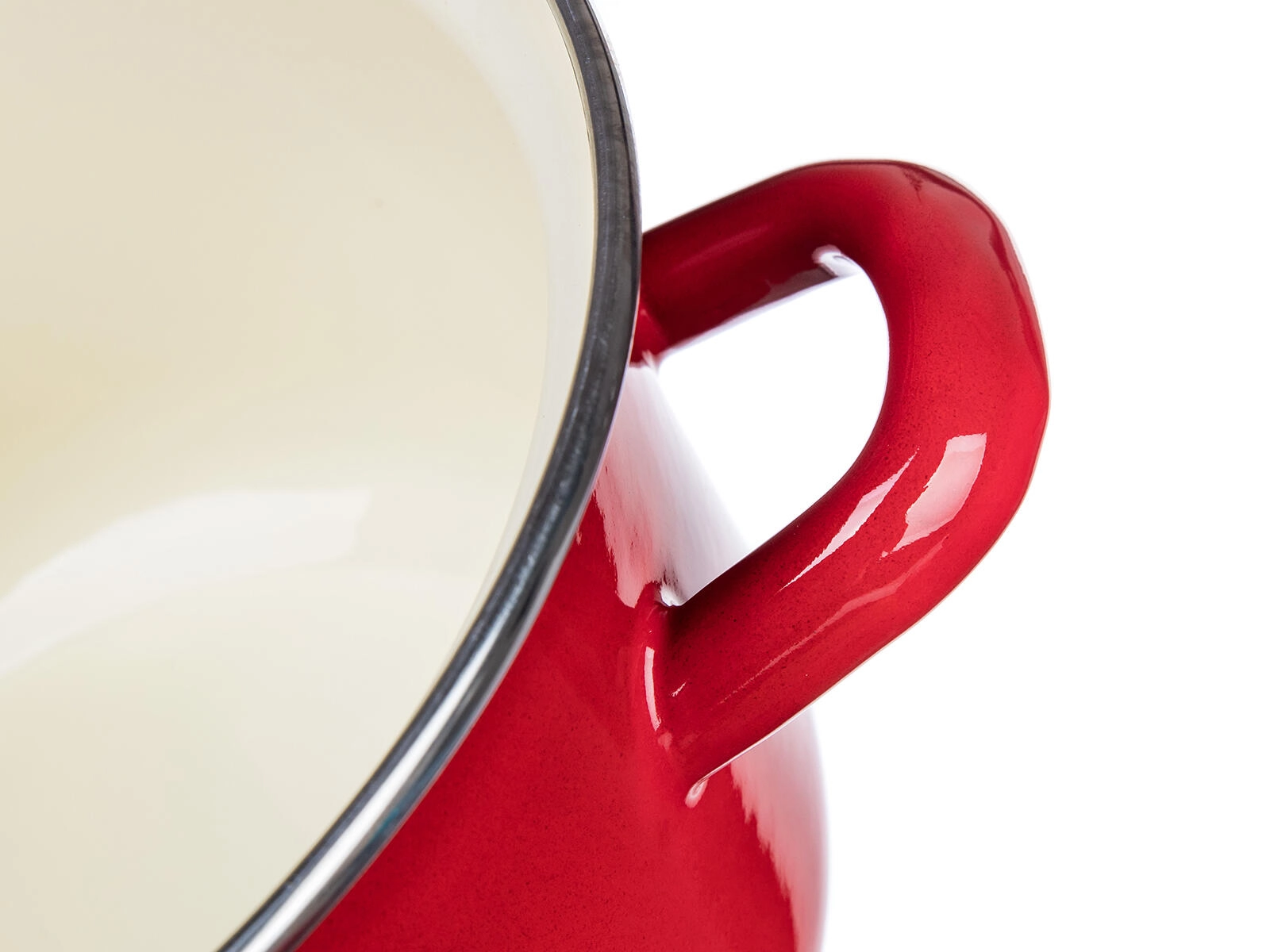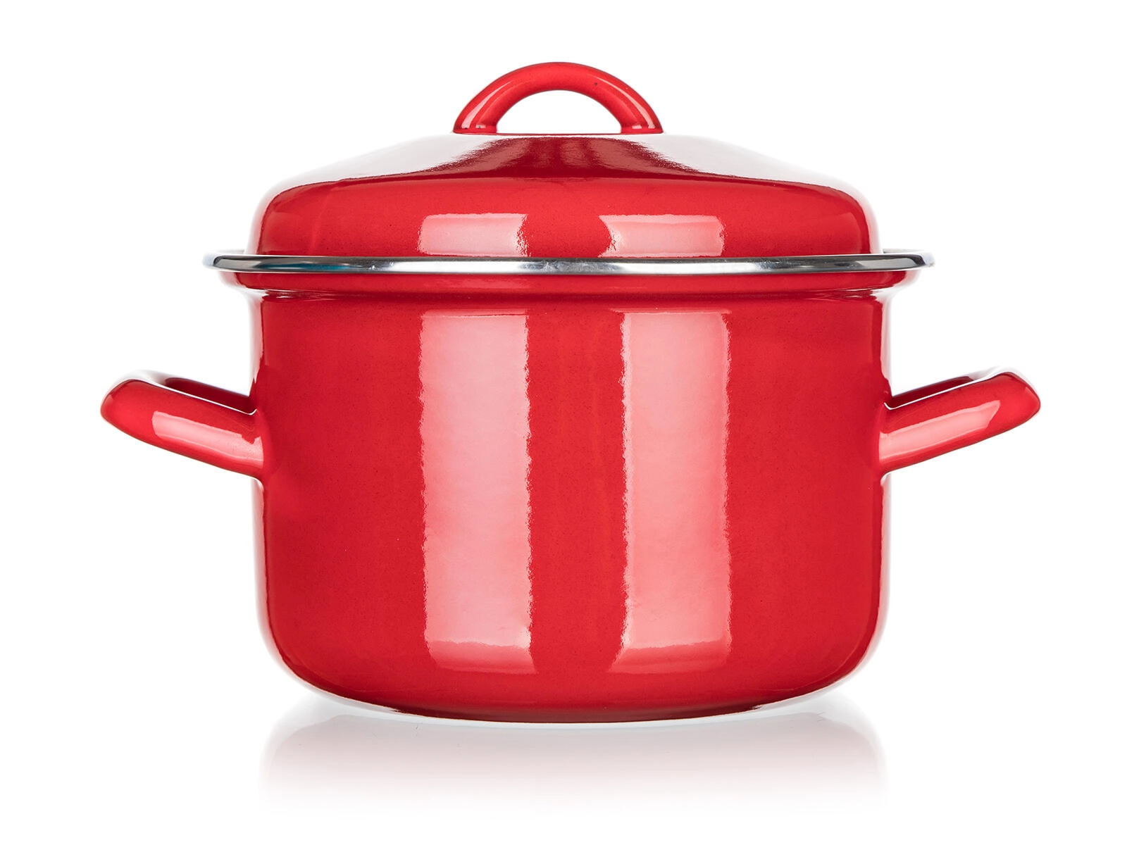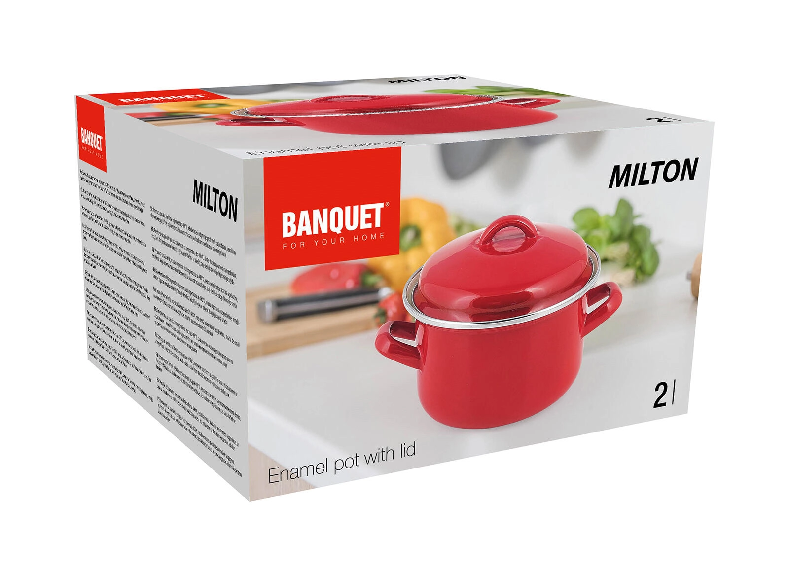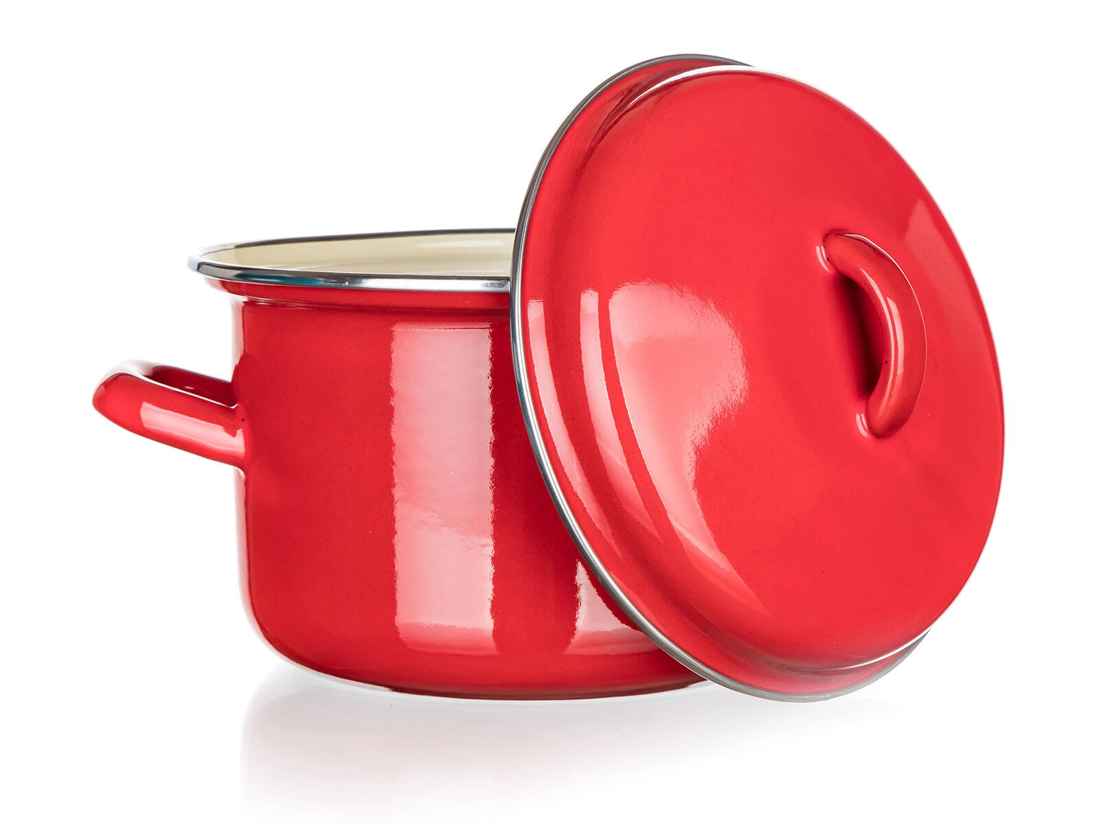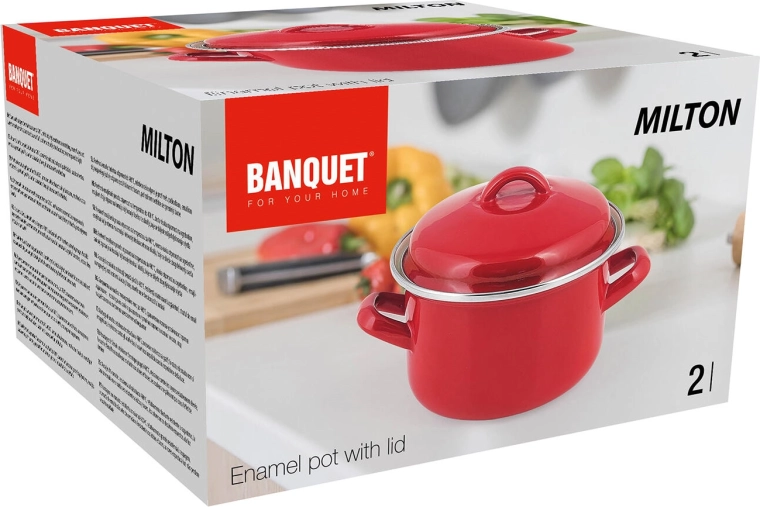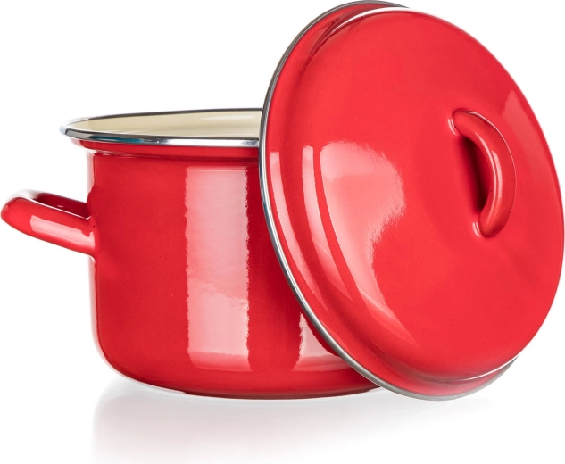 Praktische geëmailleerde pan MILTON met een inhoud van 2 l en een diameter van 16 cm is ideaal voor dagelijks koken van soepen, sauzen en bijgerechten. De duurzame geëmailleerde glazuur in elegante rode kleur met een crèmekleurige binnenkant is eenvoudig te reinigen en garandeert een lange levensduur. Dankzij de compatibiliteit met alle kookplaten, inclusief inductie, is het een veelzijdige hulp in elke keuken.