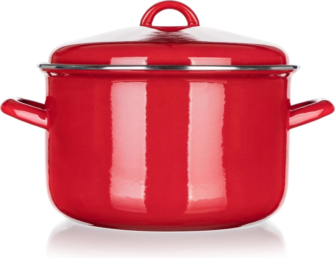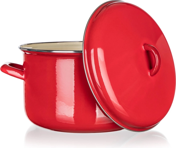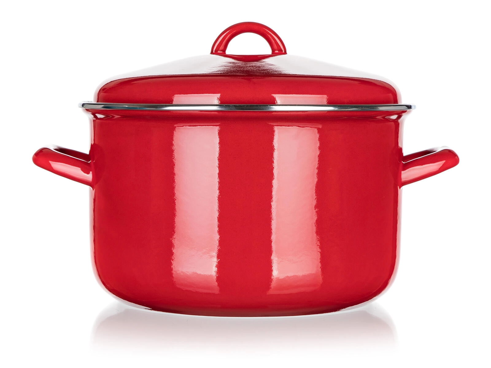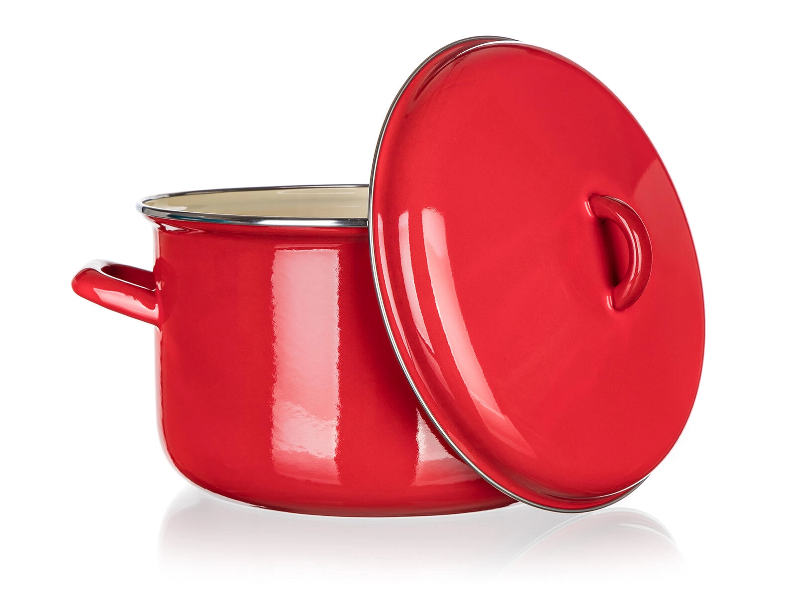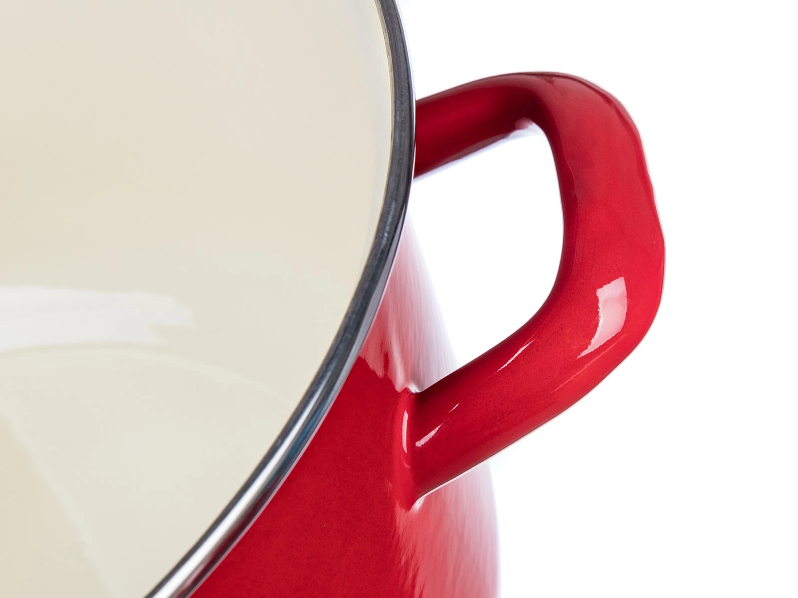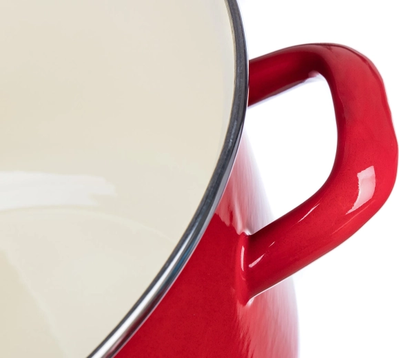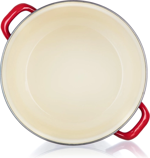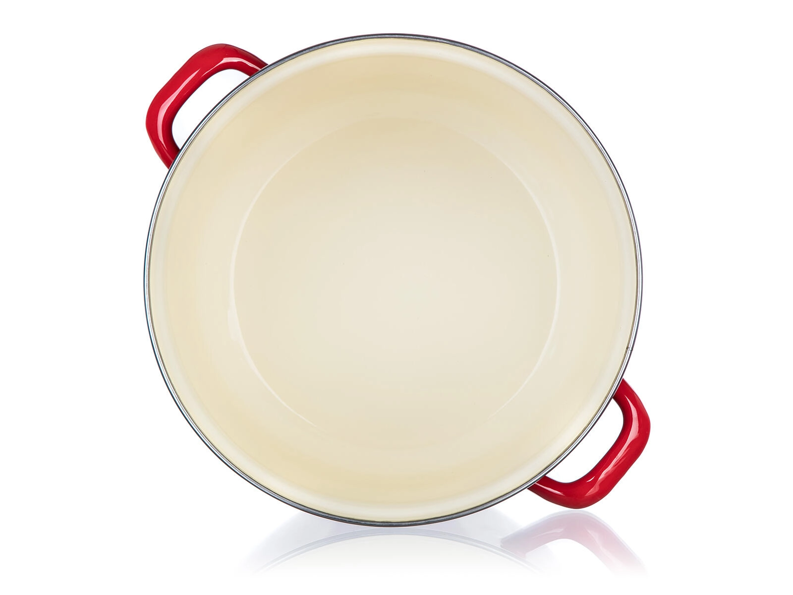 De rode geëmailleerde glazuur met crèmekleurige binnenkant is vlekbestendig en eenvoudig te reinigen. Ideaal voor dagelijks gebruik.