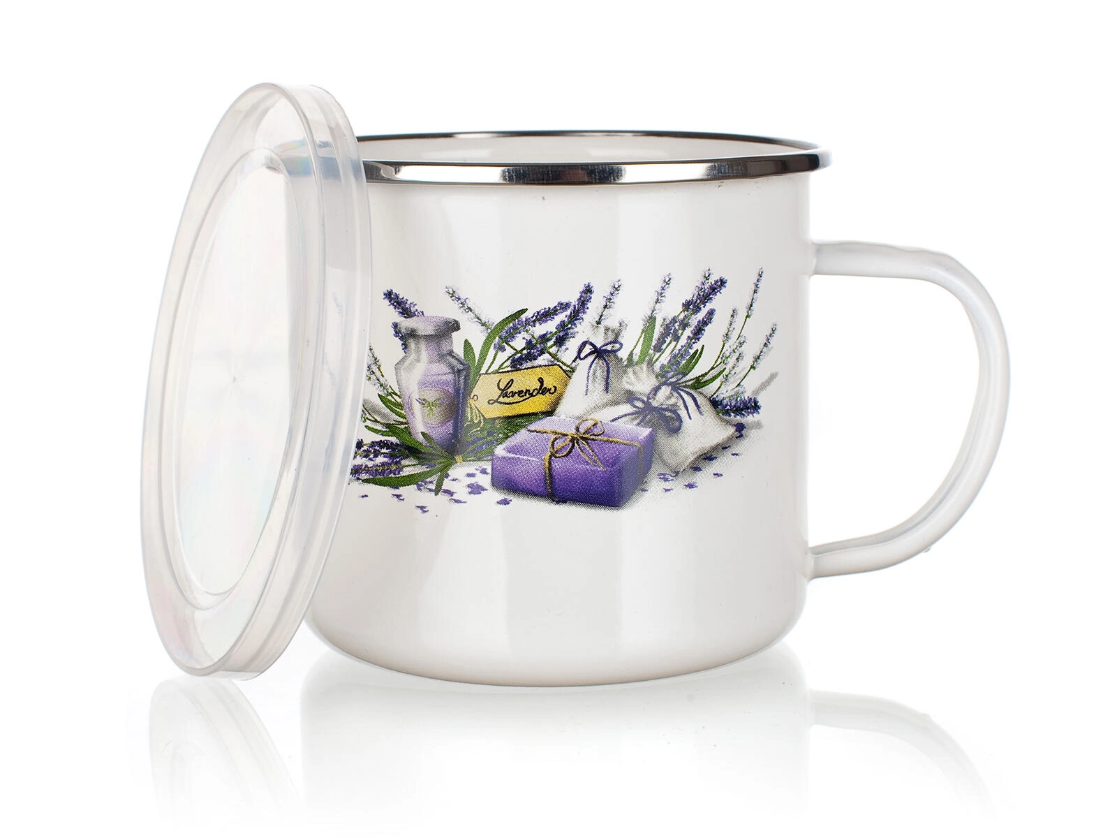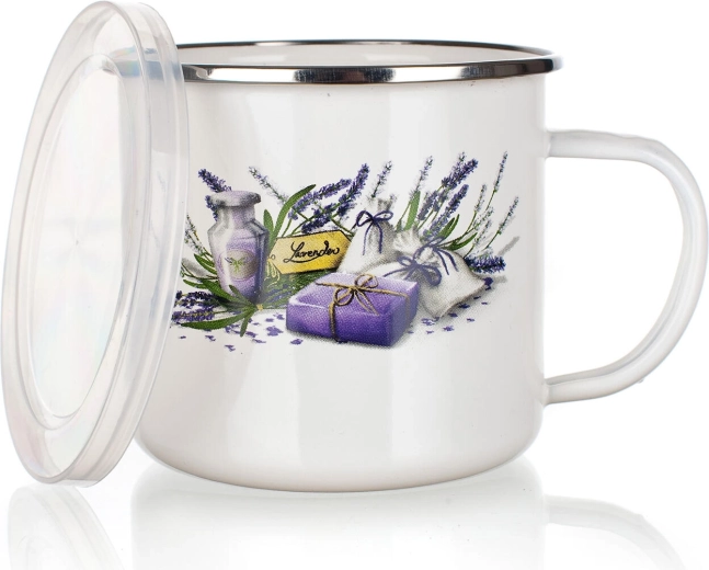 Elegante geëmailleerde mok met het motief Lavender en een inhoud van 0,5 l, ideaal voor koffie, thee en koude dranken. De praktische kunststof deksel helpt de drank langer warm te houden, beschermt tegen stof en vermindert morsen. Het duurzame geëmailleerde oppervlak garandeert een lange levensduur en eenvoudig onderhoud.