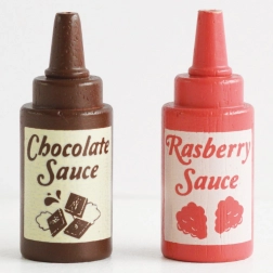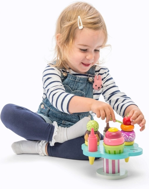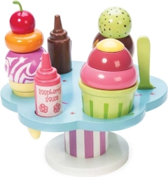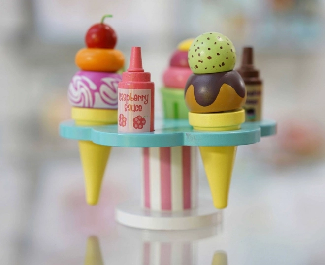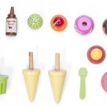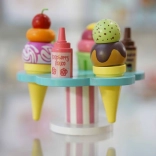 Afneembare bolletjes, hoorntjes en een bekertje nodigen uit om “smaken” te mixen en te versieren met frambozen- of chocoladesaus. Perfect voor een spelletje ijssalon.
