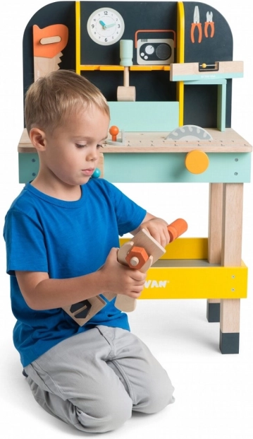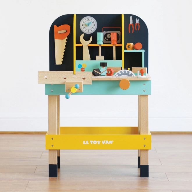 De houten kinderwerkbank ALEX van LE TOY VAN biedt alles wat jonge reparateurs nodig hebben voor realistisch spel. Dankzij de stevige afwerking van gecertificeerd FSC-hout en niet-giftige verven is hij veilig, duurzaam en milieuvriendelijk. Inclusief ingebouwde cirkelzaag, meetlat en werkbankschroef, een bovenplank met haken en een onderste opbergruimte voor extra uitrusting.