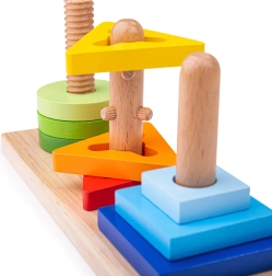 Elk pinnetje heeft een andere constructie voor cirkels, driehoeken en vierkanten – kinderen moeten de stukjes correct plaatsen en vaak ook draaien.