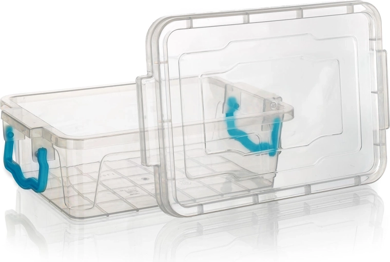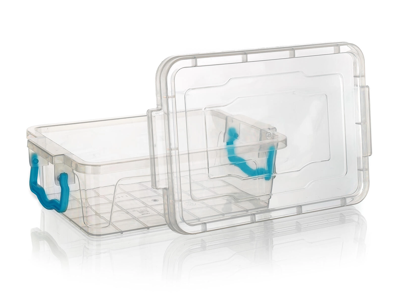 De rechthoekige Gema-doos is ideaal voor het bewaren van etenswaren in en buiten de keuken. Dankzij de transparante behuizing heeft u altijd overzicht over de inhoud, terwijl de opvallende turquoise handgrepen het openen en dragen vergemakkelijken. Het materiaal van hoogwaardige kunststof kan temperatuurschommelingen in zowel vriezer als magnetron aan.