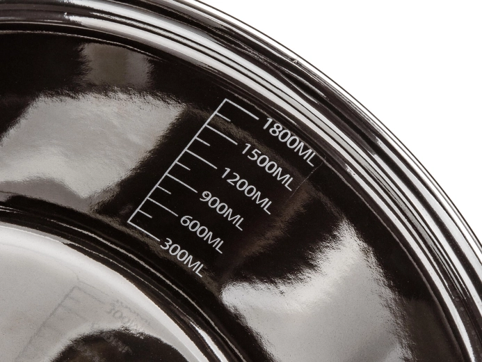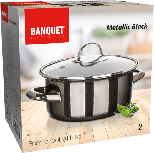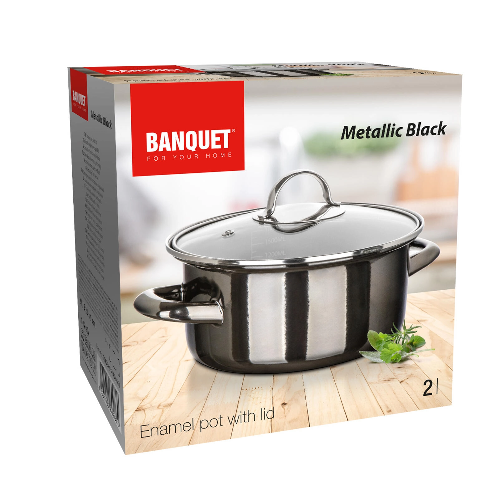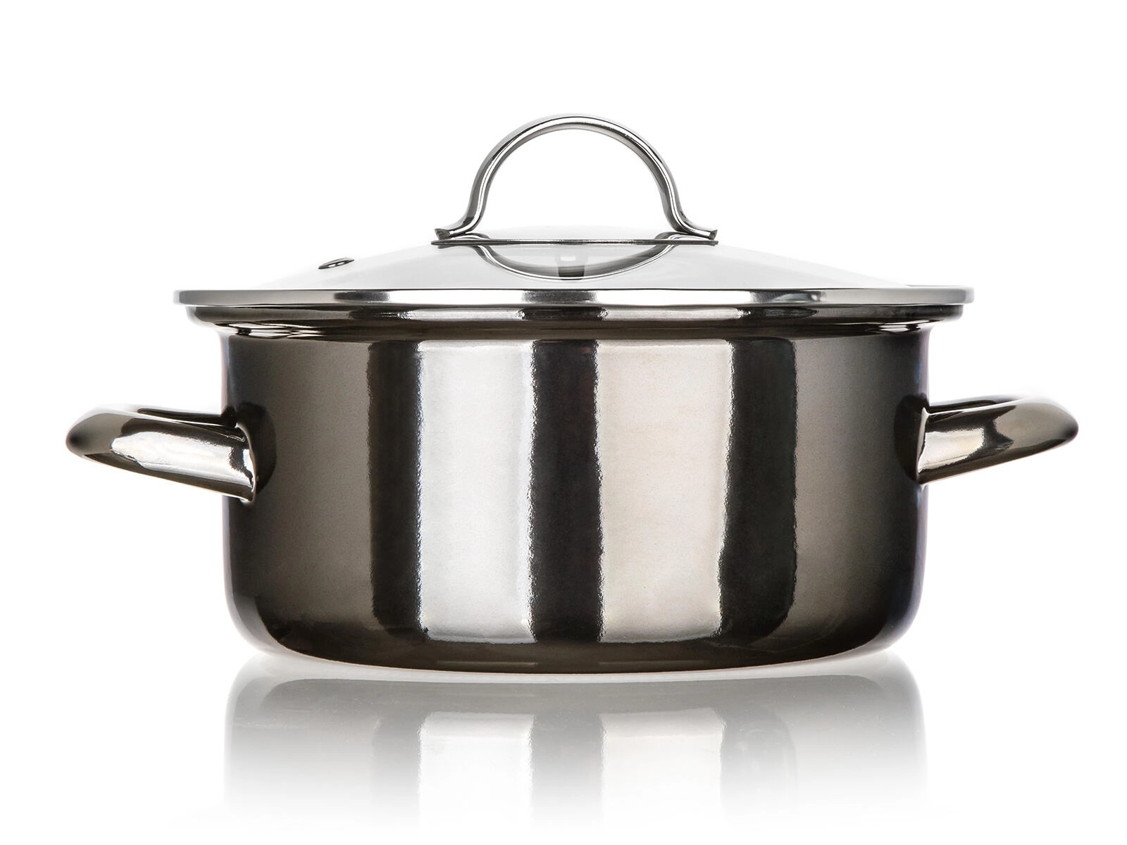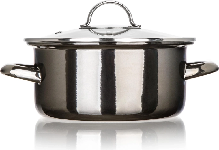 Elegante geëmailleerde pan in Metallic Black met een inhoud van 2 liter en een diameter van 20 cm – ideaal voor dagelijks koken. Dankzij het glazen deksel houd je zicht op het kookproces, de duurzame emaillaag zorgt voor een lange levensduur en de compatibiliteit met alle soorten kookplaten, inclusief inductie, biedt maximale veelzijdigheid.