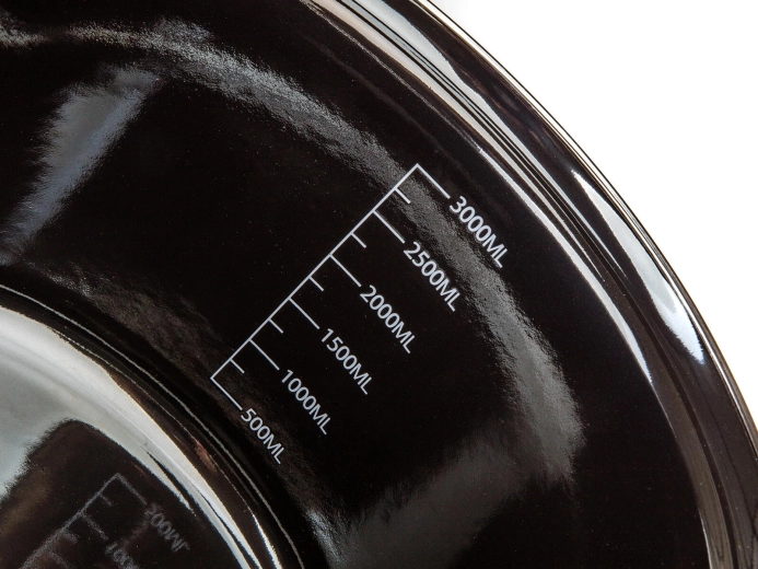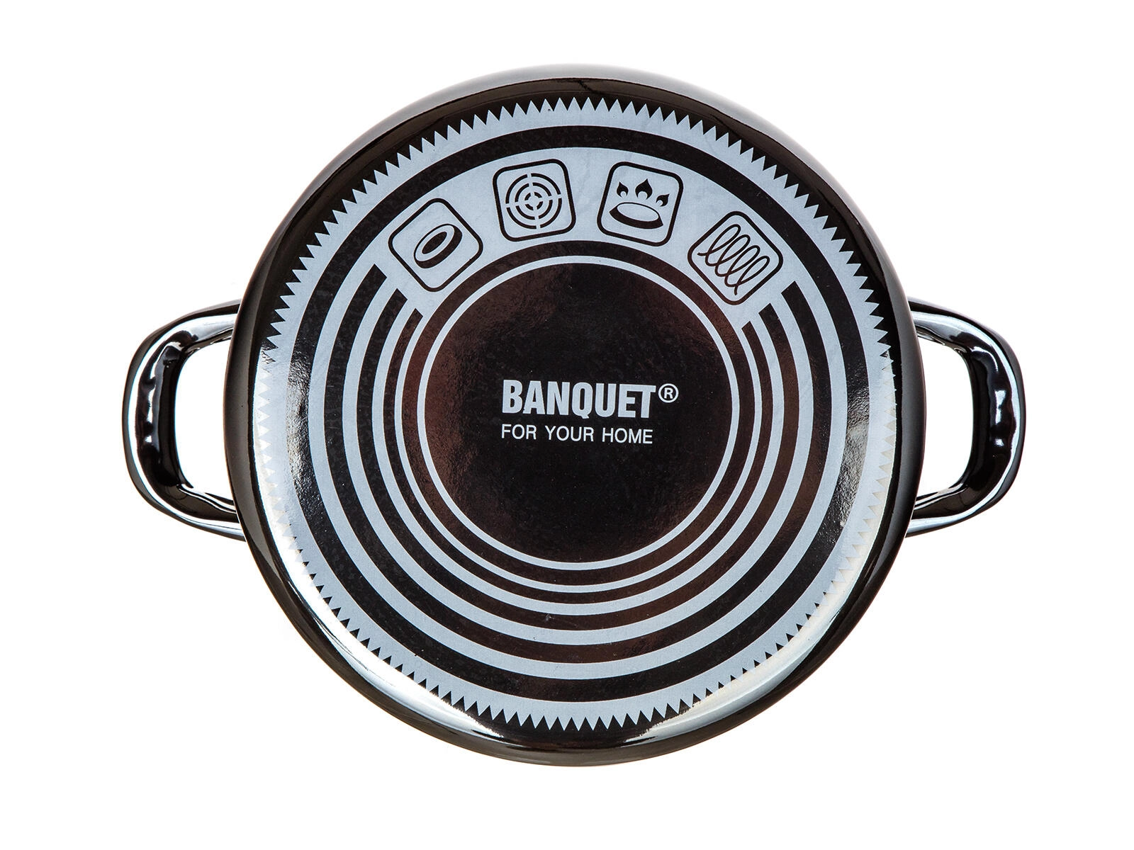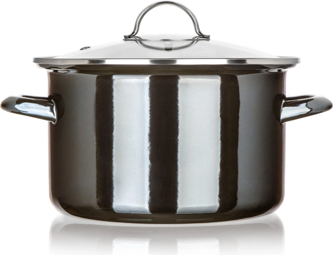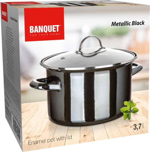 Het geëmailleerde oppervlak in zwarte metallic is duurzaam en eenvoudig te reinigen, terwijl de robuuste zijhandgrepen zorgen voor veilig dragen.