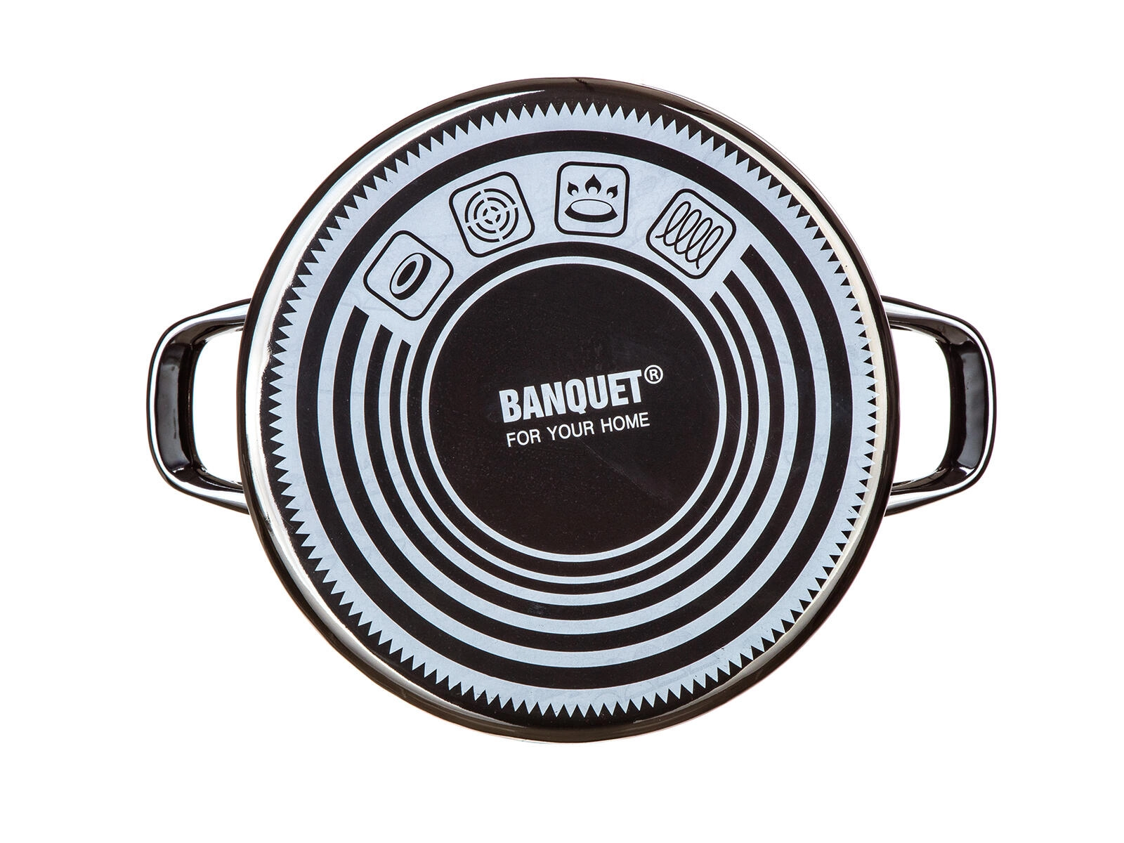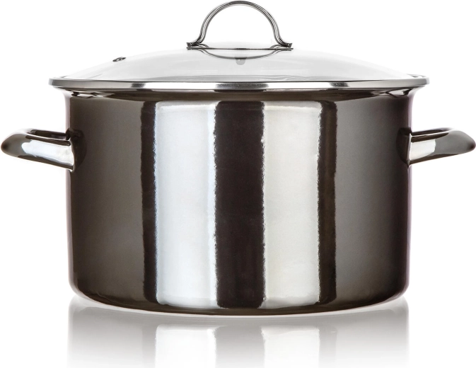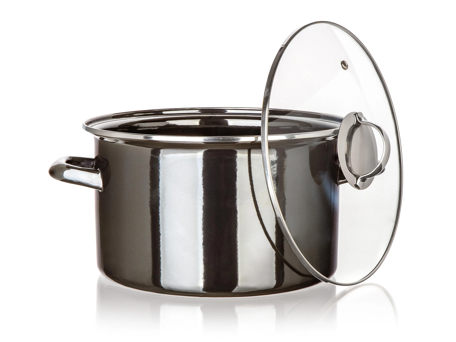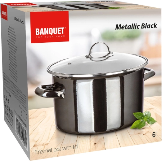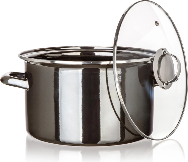 Praktische geëmailleerde pan met een inhoud van 6 liter, een diameter van 26 cm en een glazen deksel in de elegante kleur Metallic Black. Geschikt voor alle soorten kookplaten, inclusief inductie, met duurzame handgrepen en eenvoudig onderhoud voor dagelijks koken van soepen, sauzen en stoofgerechten.