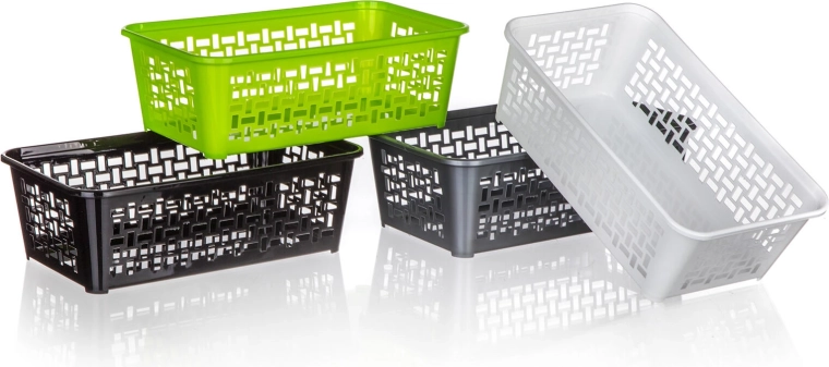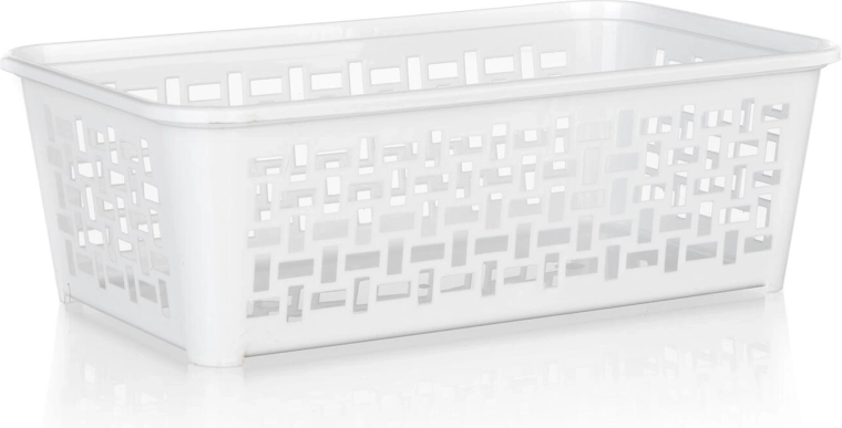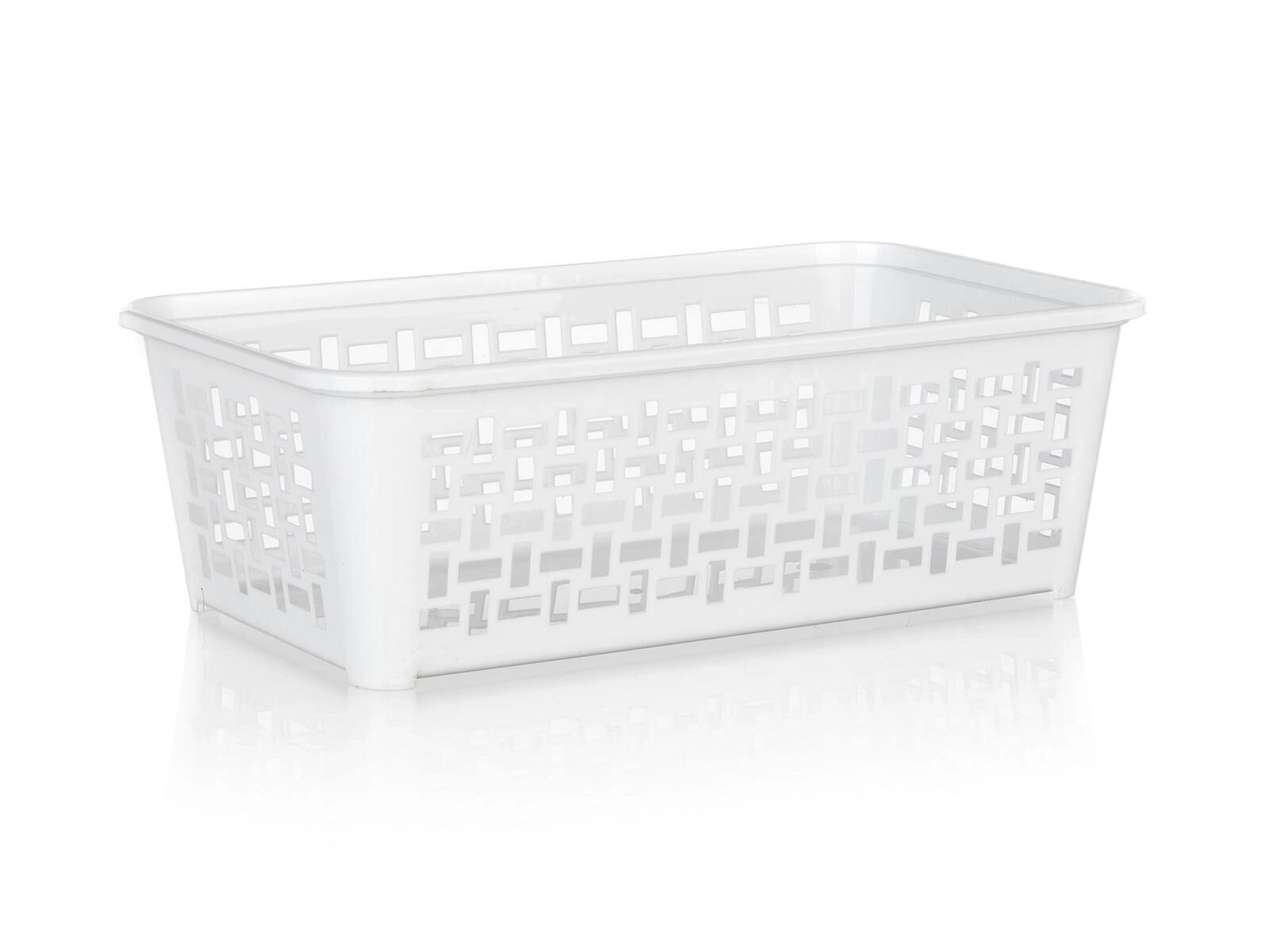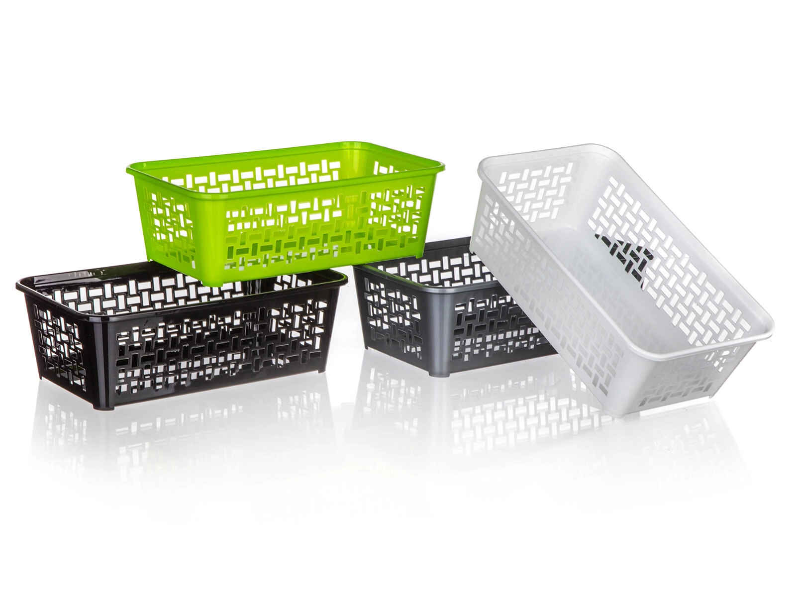 Praktische kunststof mand met afmetingen 24,7 × 14,7 × 8 cm helpt je orde te houden in de badkamer, keuken en op kantoor. Dankzij de geperforeerde zijkanten is de inhoud altijd overzichtelijk en goed geventileerd. De mand kan dwars in een grotere mand van 35,8 × 25,6 cm worden geplaatst om zo een tussenniveau te creëren dat ruimte bespaart. Verkrijgbaar in een mix van kleuren om eenvoudig op je interieur af te stemmen.