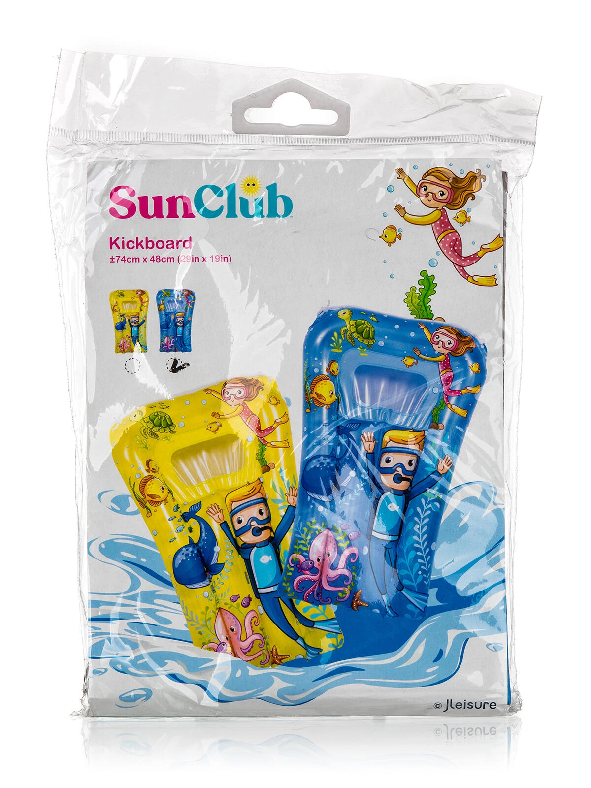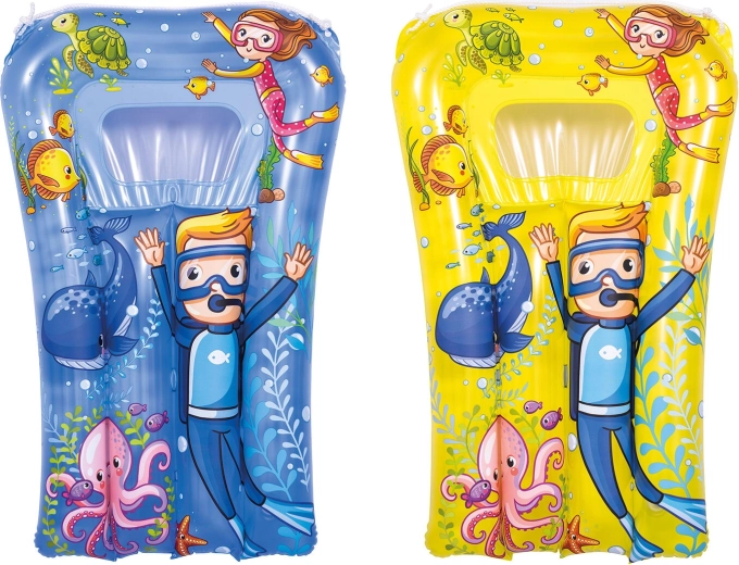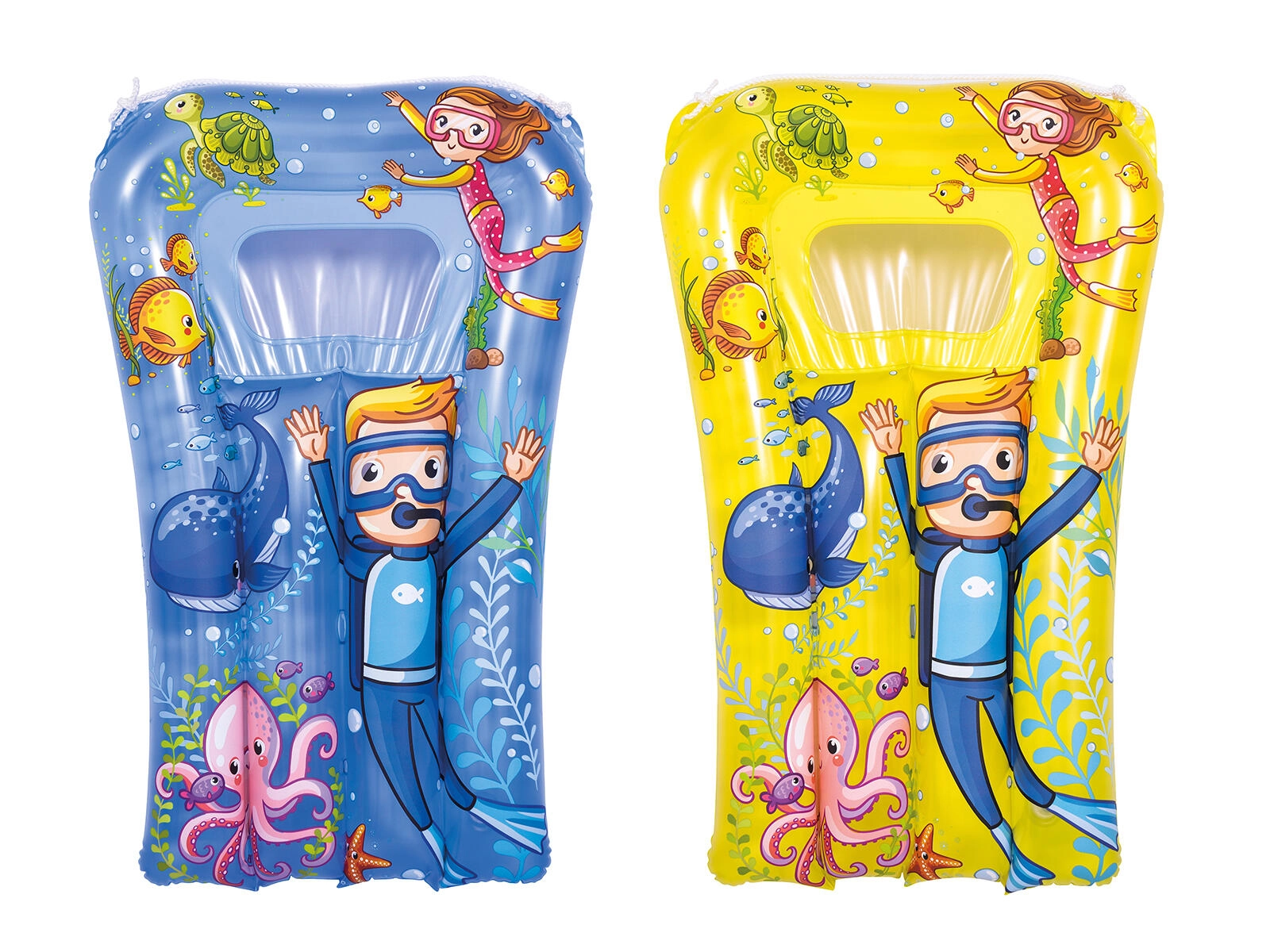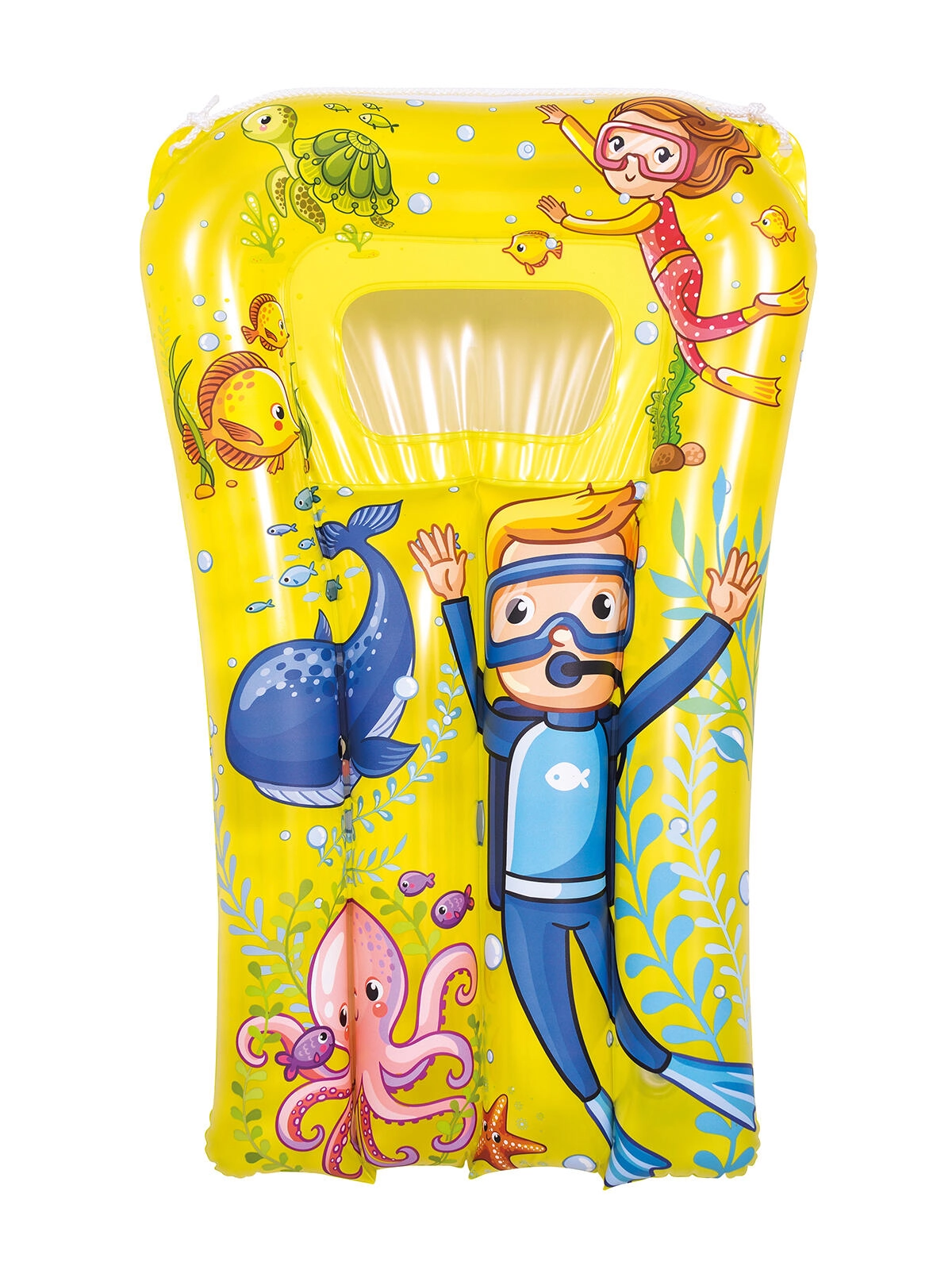 Geniet volop van de zomer met dit compacte opblaasbare kinderluchtbed van 67 × 43 cm. Dankzij het geïntegreerde transparante kijkraampje en de comfortabele hoofdbsteun biedt het leuk kijken onder het wateroppervlak, veilig drijfvermogen en makkelijk sturen in het water. Verkrijgbaar in een kleurenmix – geel en blauw met vrolijke zeethema’s.