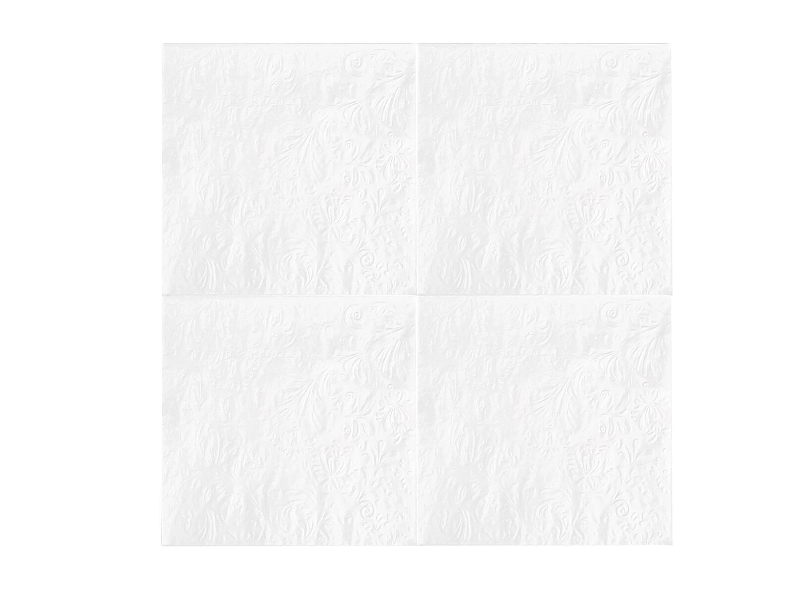 Deze witte servetten met een bescheiden reliëf zijn ideaal voor feestelijke gedekte tafels, familiefeesten en dagelijks dineren. Dankzij de drie lagen zijn ze aangenaam zacht, maar toch stevig en goed absorberend. Het universele formaat van 33 × 33 cm zorgt voor comfort thuis, op school en onderweg.