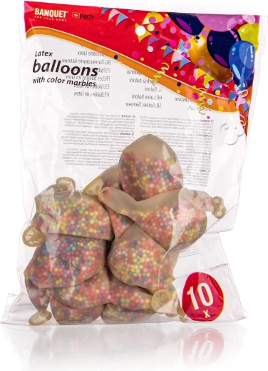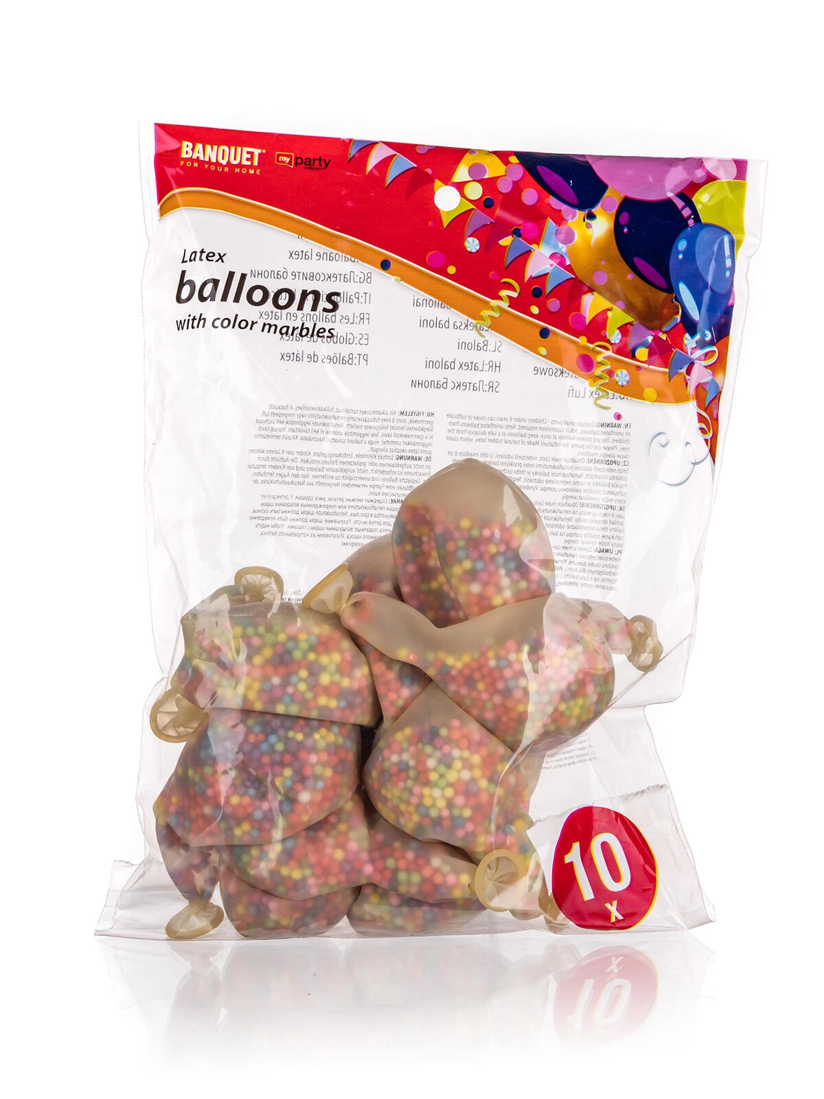 Verlicht elk feest met de set latexballonnen met bolletjes van MY PARTY. In de verpakking vind je 10 stuks hoogwaardige, gezondheidsvriendelijke ballonnen met een diameter van ca. 30 cm, gevuld met gekleurde polyesterbolletjes voor een opvallend effect. Ideaal voor verjaardagen, feestjes en feestelijke decoraties.
