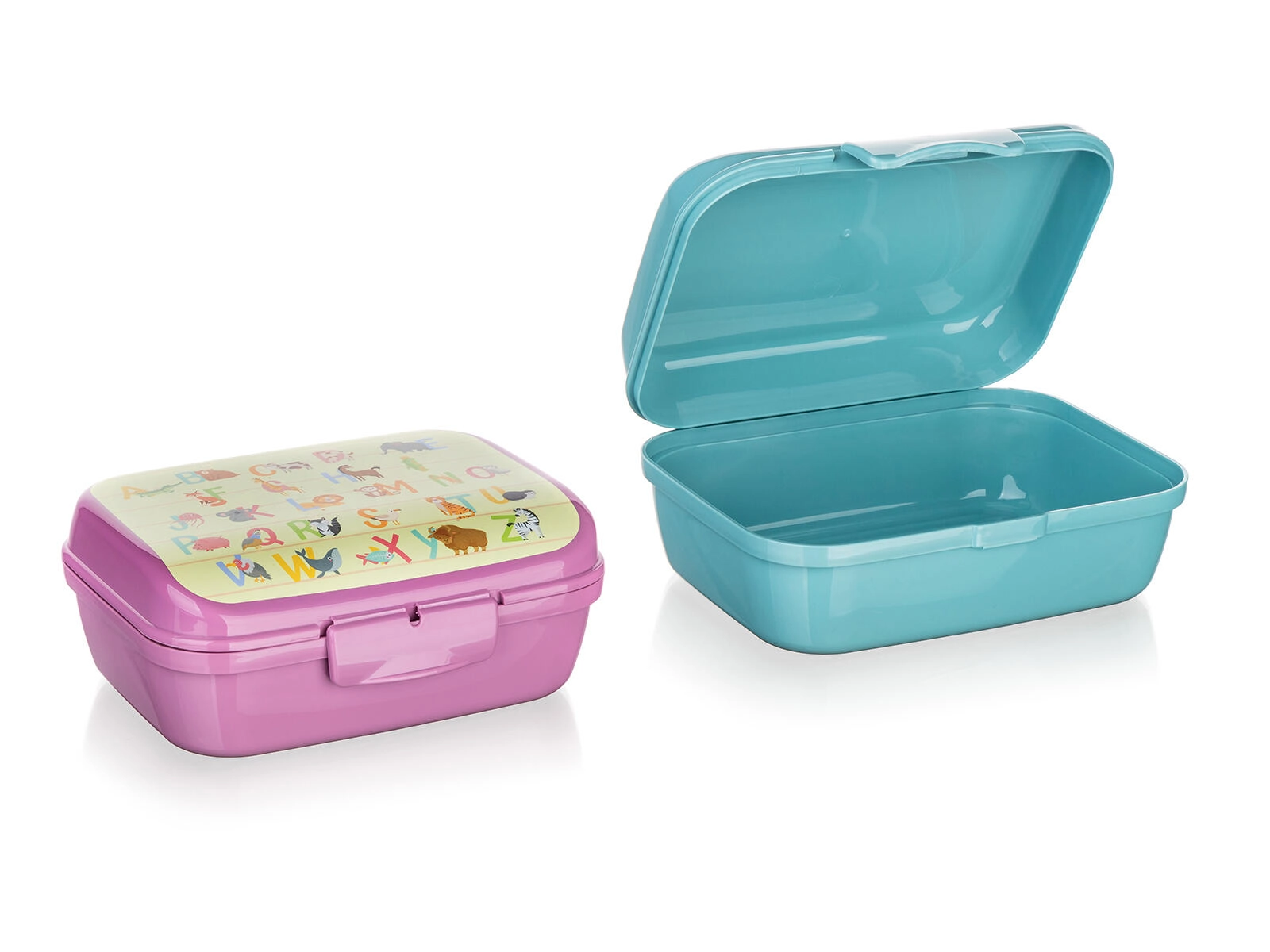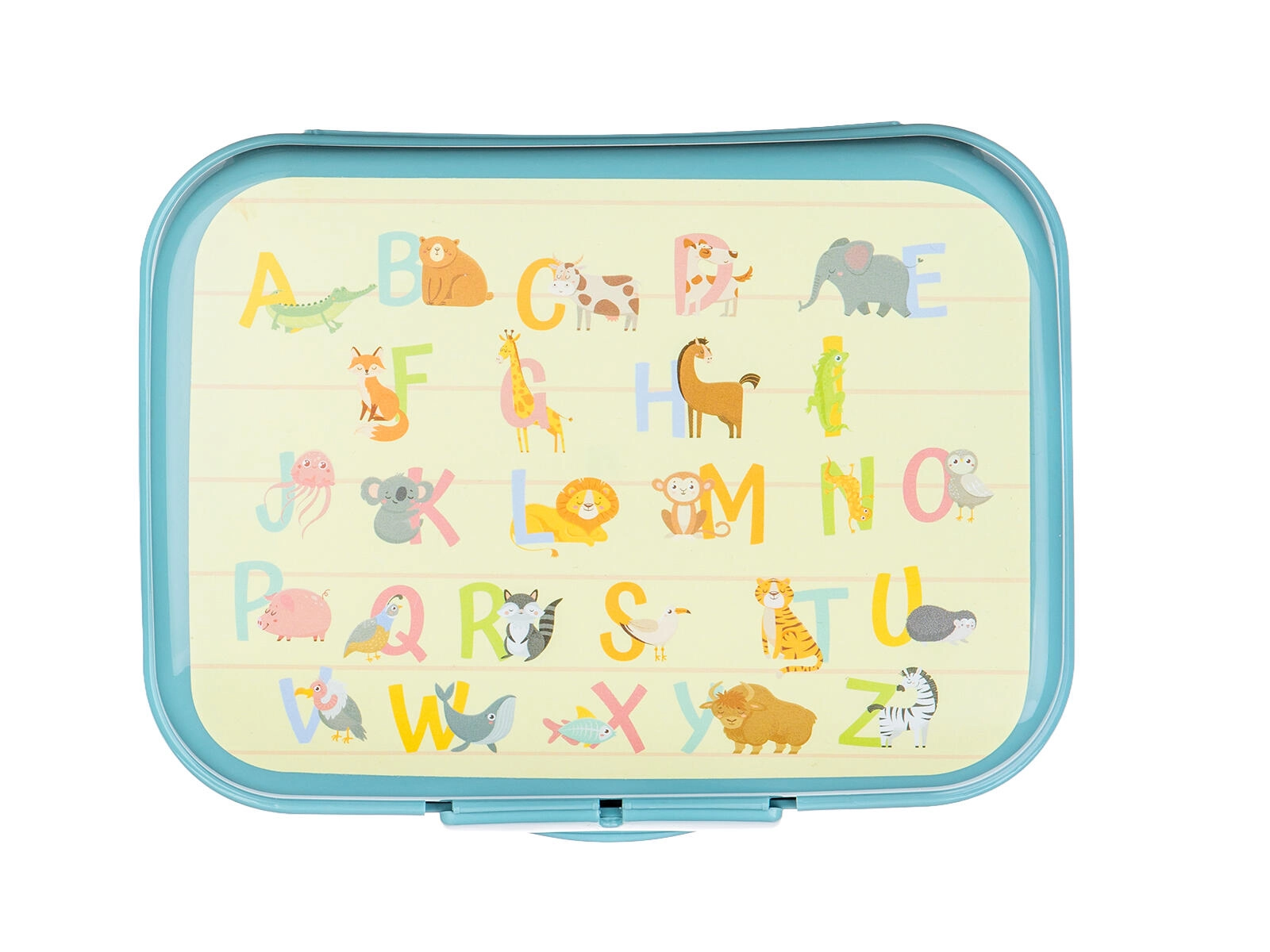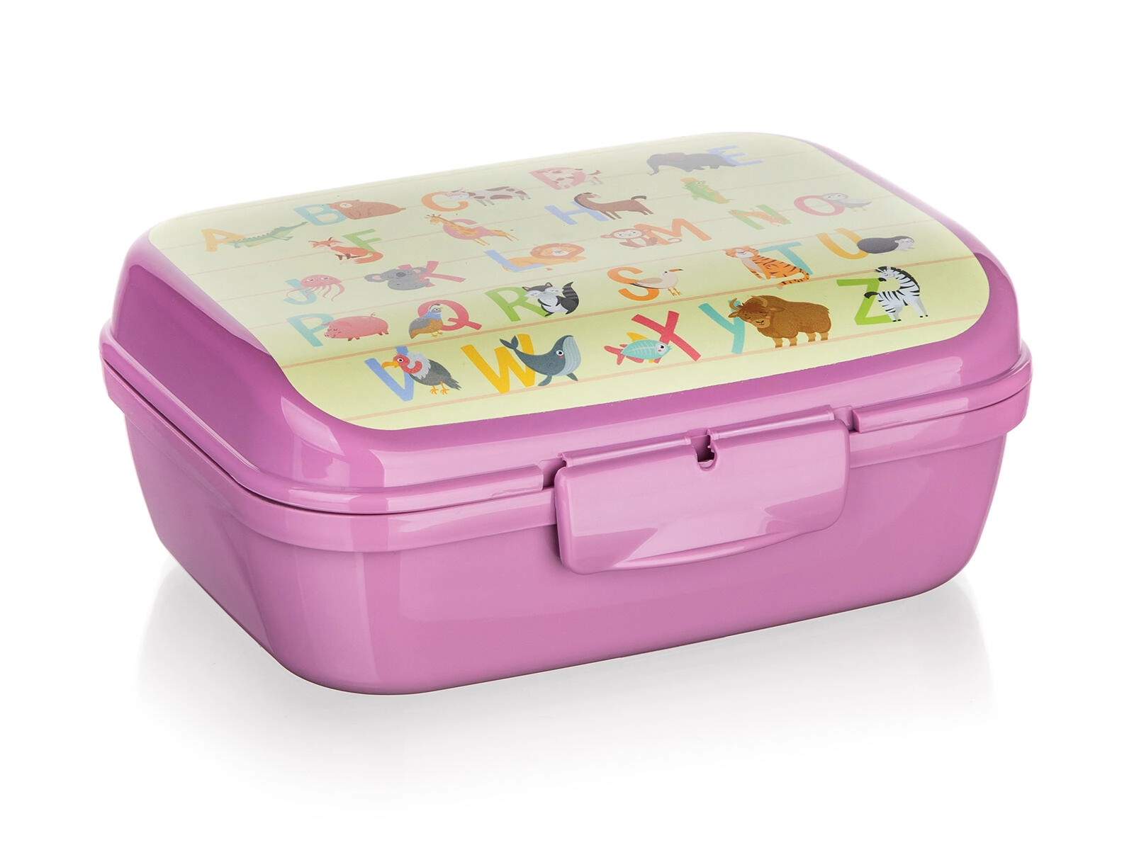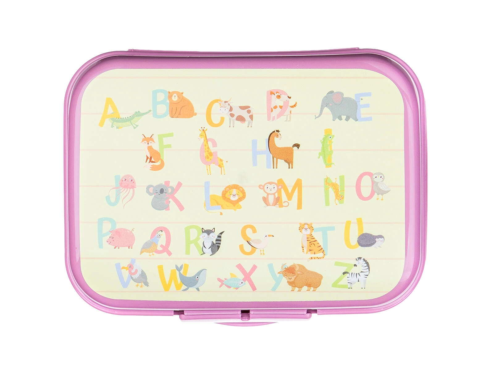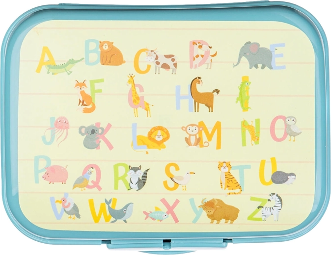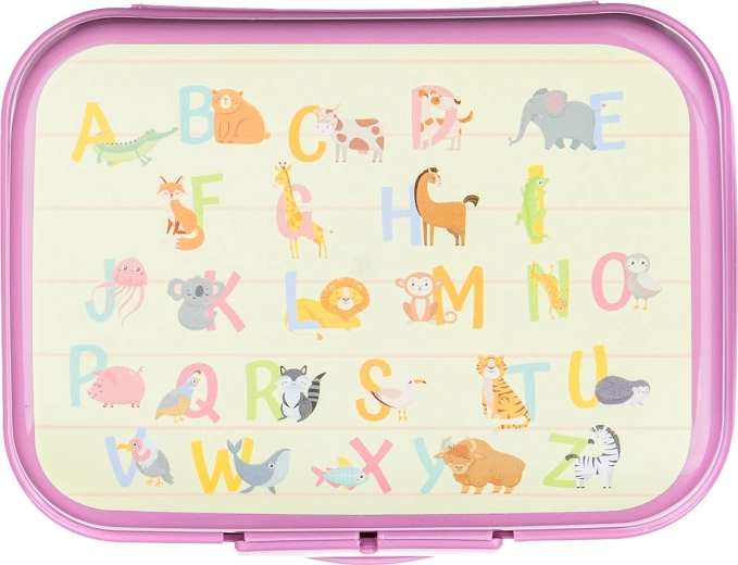 Het kleurrijke alfabet met diertjes motiveert kinderen om te snacken en geeft het doosje een speelse uitstraling.