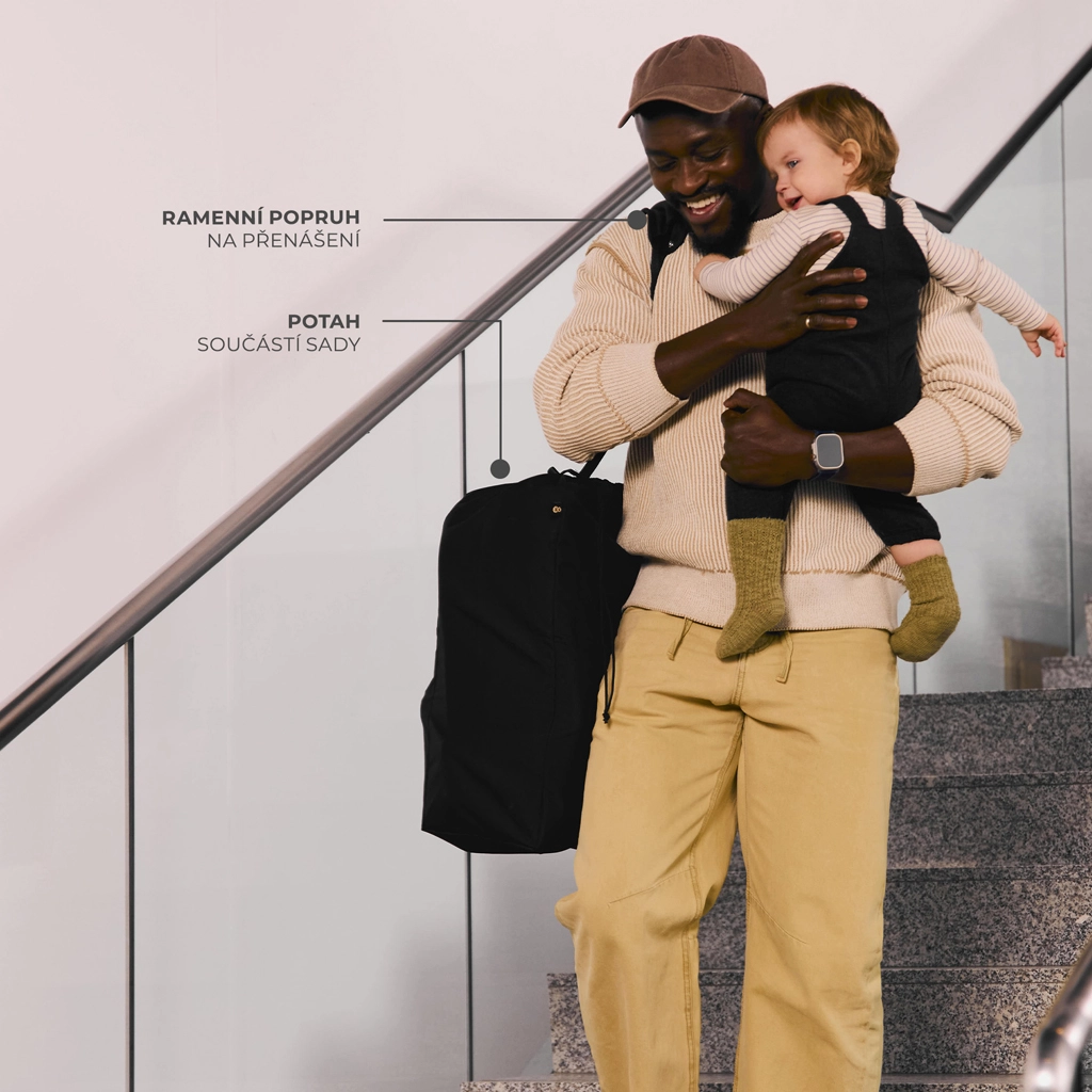 Het intuïtieve mechanisme maakt bliksemsnel opvouwen tot een compact pakket dat voldoet aan de IATA-normen voor handbagage. Na het opvouwen staat de buggy zelfstandig en de geïntegreerde schouderriem maakt dragen eenvoudig.