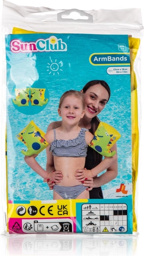 Helder gele bandjes met een schattige dinosaurus stimuleren het plezier in het zwemmen en vergroten de zichtbaarheid van het kind in het water.