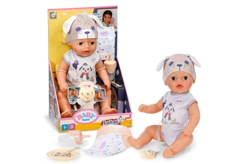 Maak kennis met de pop BABY born Lukas hondje – een geweldige keuze voor het eerste speelplezier. Dankzij het compacte formaat van 36 cm ligt hij prettig in kleine kinderhandjes en kan hij alles wat belangrijk is, zonder batterijen. Realistische functies zoals drinken uit een flesje, in de luier plassen of op het potje zitten bieden kinderen een authentieke verzorgingservaring.