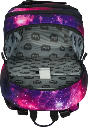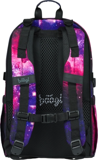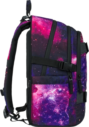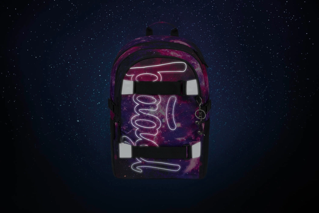 Ontdek een complete schooluitrusting in een uniforme kosmische stijl. De ergonomisch ontworpen rugzak met een inhoud van 25 l en een gewicht van slechts 850 g heeft drie compartimenten met organizer, een vak voor een 15" laptop of tablet, elastische zijvakken voor een fles en voorste banden voor het bevestigen van een skateboard. Volledig verstelbare schouder-, borst- en zijkompressieriemen zorgen voor perfecte pasvorm en comfort, terwijl reflecterende elementen de veiligheid op weg naar school vergroten.