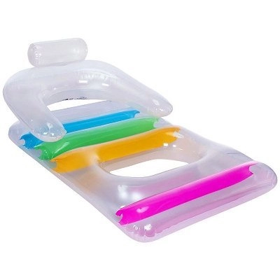 Geniet optimaal van de zomer met dit multifunctionele opblaasbare ligbed, dat ook dienstdoet als comfortabele waterstoel. Het biedt een geïntegreerde rugleuning, armleuningen en een opblaasbaar kussen voor maximale ontspanning bij het zwembad en op het strand. De transparante body met gekleurde kamers is stijlvol en goed zichtbaar, het duurzame PVC-materiaal zorgt voor een lange levensduur. Inclusief reparatiepatch.
