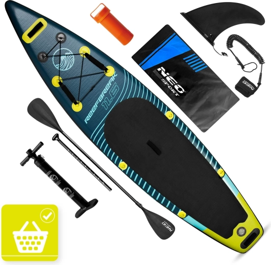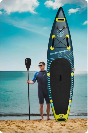 Ontdek de stabiele en duurzame opblaasbare paddleboard Reefbreak 11'6, die onvergetelijke waterervaringen biedt. In de complete set vind je een verstelbare peddel, een dubbelwerkende pomp met manometer, een leash, een vin, een reparatieset en een slijtvaste transportrugzak. Dankzij de antislip EVA pad, drie stabilisatievinnen en het hoge draagvermogen tot 150 kg is hij ideaal voor rustig water en kleinere golven.
