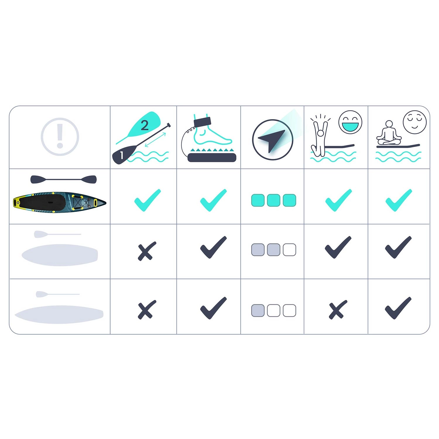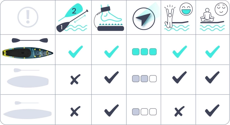 Drie vinnen zorgen voor koersstabiliteit en soepel draaien. Ideaal voor kalm water en kleinere golven, voor zowel beginners als gevorderden.