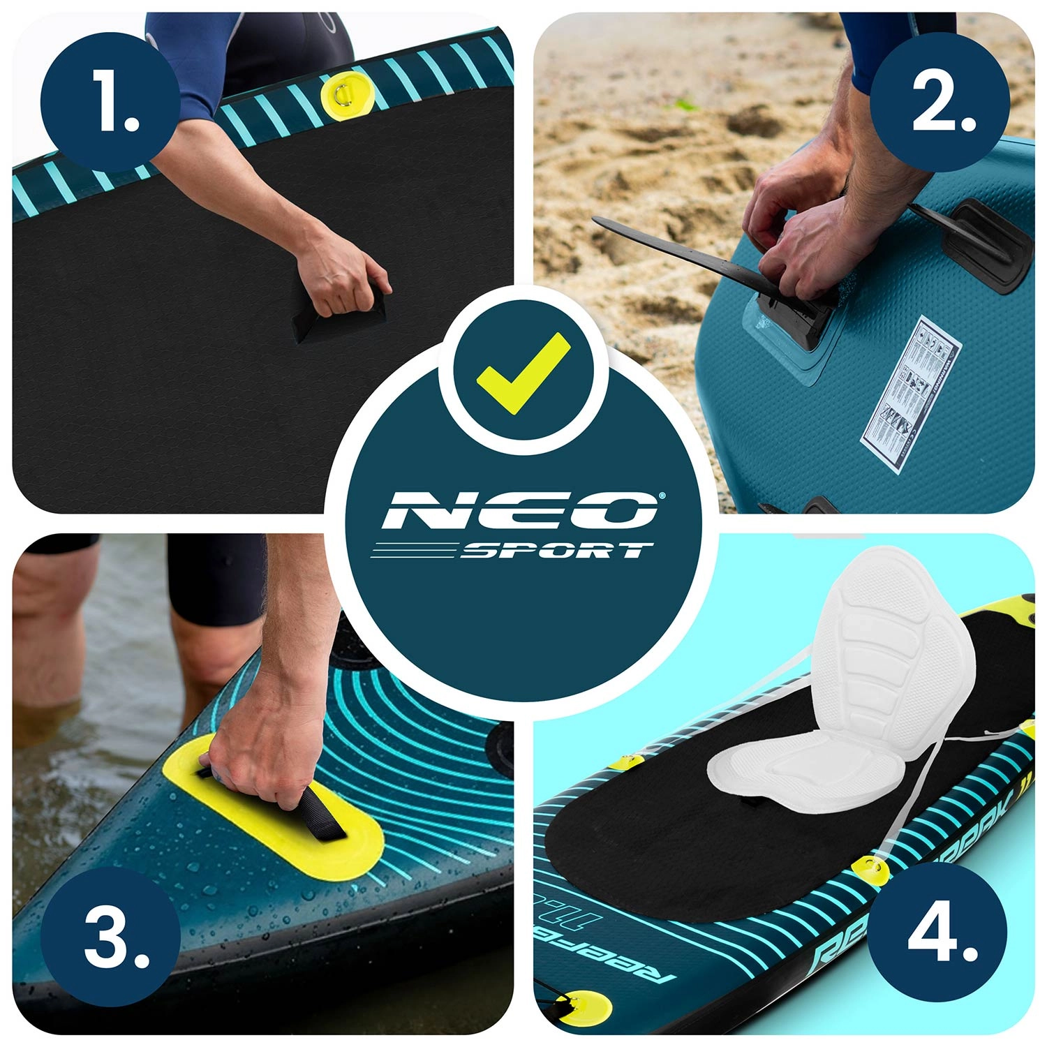 Alles wat je nodig hebt in één pakket: verstelbare peddel, dubbelwerkende pomp met manometer, veiligheidsleash, vin, reparatieset en duurzame rugzak voor eenvoudig transport.