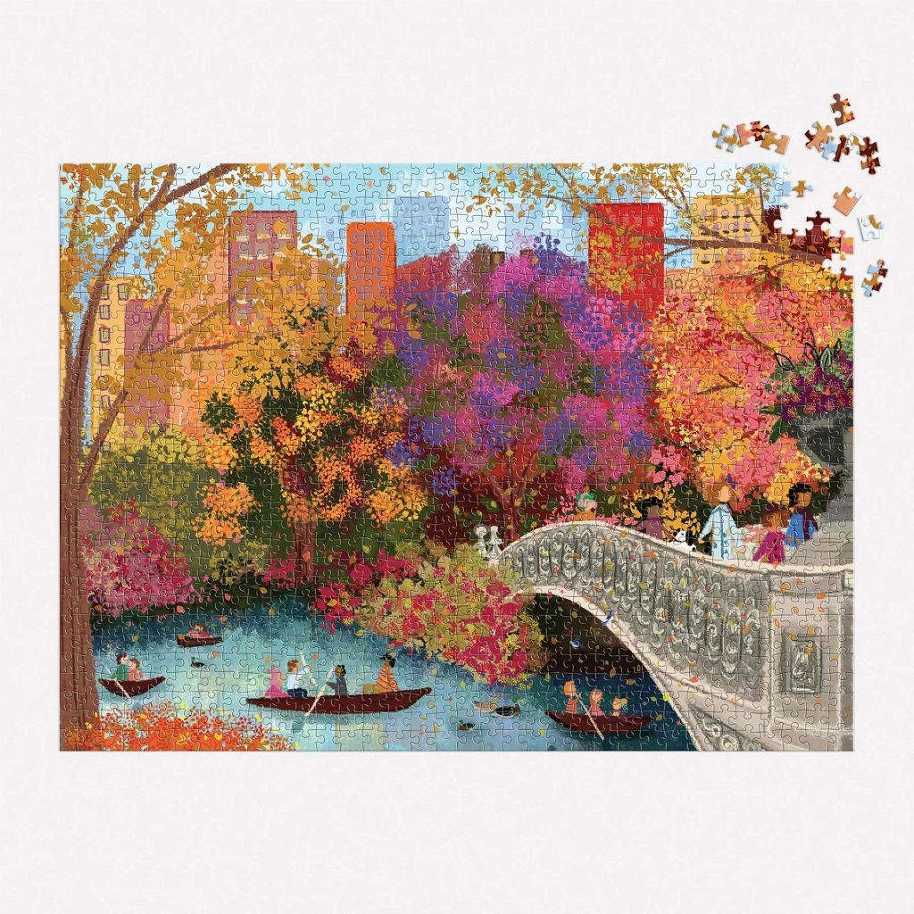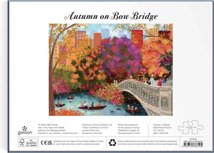 Geniet van de betoverende herfstsfeer van New York met deze GALISON-puzzel met het motief van de Bow Bridge in Central Park, geïllustreerd door Joy Laforme. 1000 precies uitgesneden stukjes bieden een fijne uitdaging, terwijl rijke kleuren en een gedetailleerde print zorgen voor plezier bij elke legfase. Verantwoord geproduceerd van FSC-gecertificeerde gerecyclede materialen en bedrukt met niet-giftige inkten.