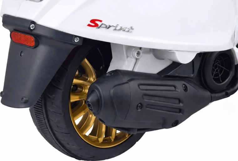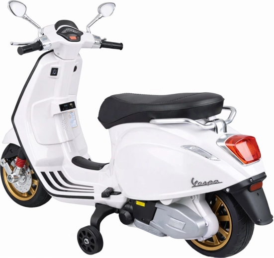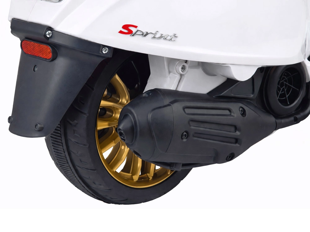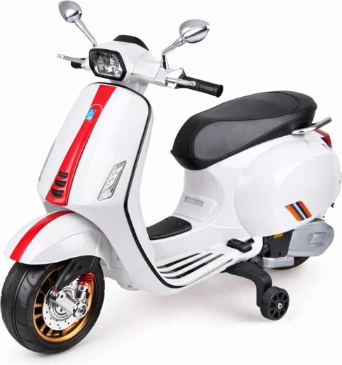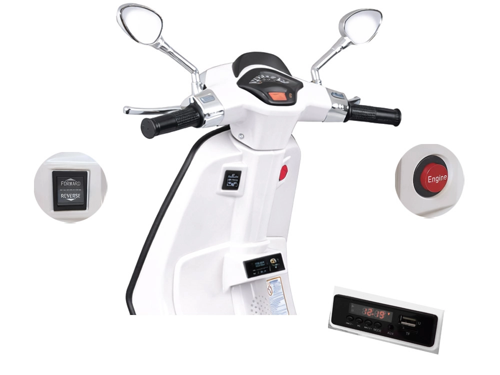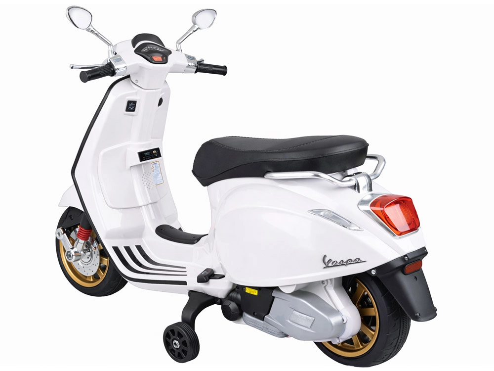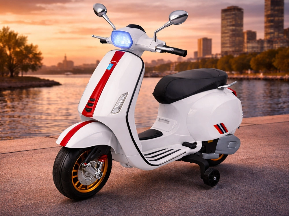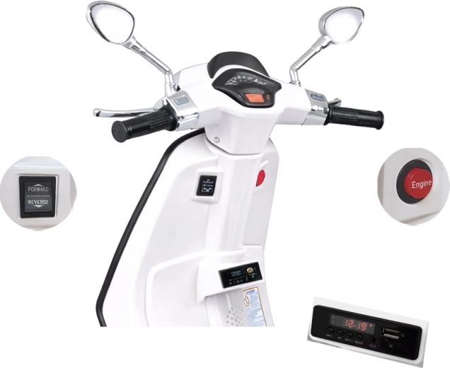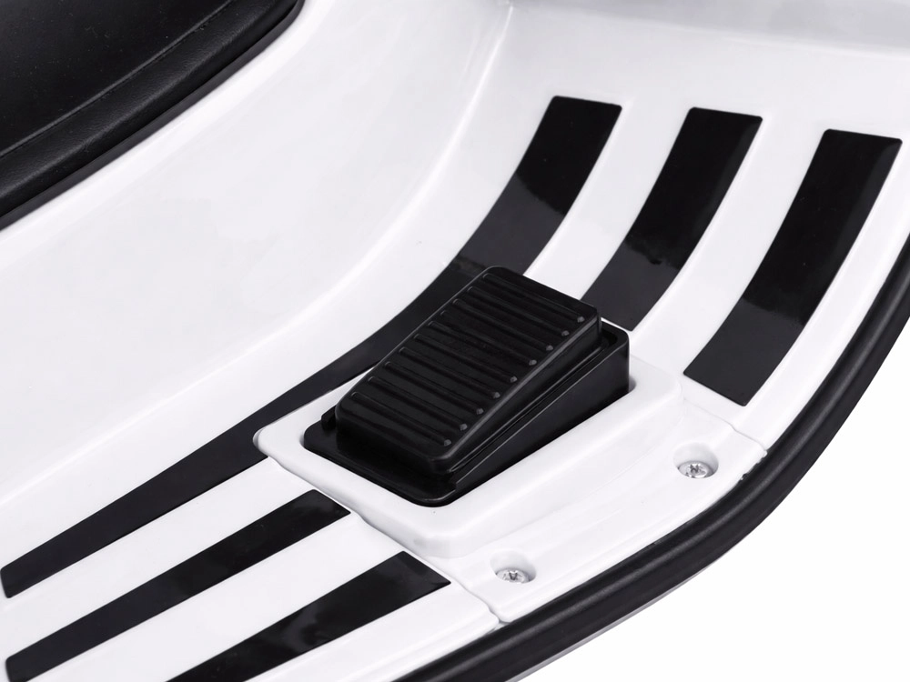 De elektrische kinderscooter in VESPA‑stijl combineert een elegant design met moderne functies. Starten gebeurt met een knop en de simulatie van het motorgeluid zorgt voor een authentieke rijbeleving. De krachtige aandrijving 2 × 12 V / 25 W en de accu 12 V / 4,5 Ah bieden een comfortabele en soepele rit, terwijl de voorlamp zorgt voor stijl en betere zichtbaarheid.