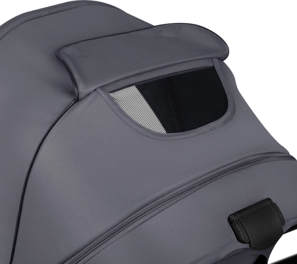 De brede, hoog geplaatste reiswieg biedt ruimte, zelfs met een voetenzak. Meerzijdige ventilatie met magnetische sluitingen houdt het klimaat het hele jaar door aangenaam.