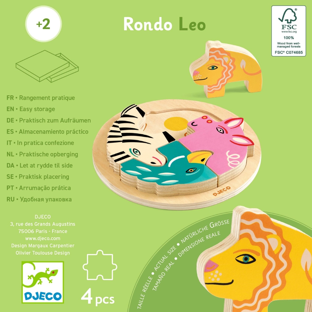 DJECO Rondo Leo is een hoogwaardige houten puzzel, ontworpen voor kinderen vanaf 2 jaar. De ronde basis met geleide groeven en duidelijk gemarkeerde plekken helpt kinderen intuïtief vier opvallende dierstukken te leggen. Dankzij de dikke, makkelijk vast te pakken onderdelen leren kinderen al spelend en ontwikkelen ze belangrijke vaardigheden.