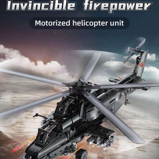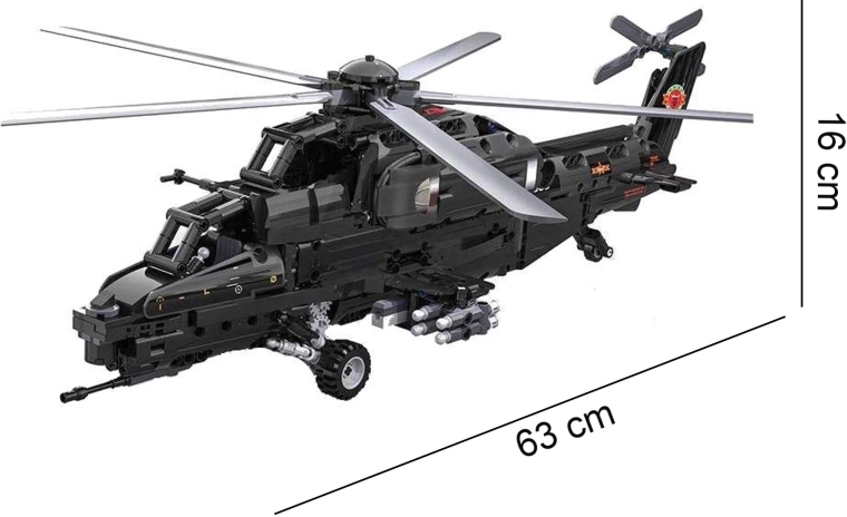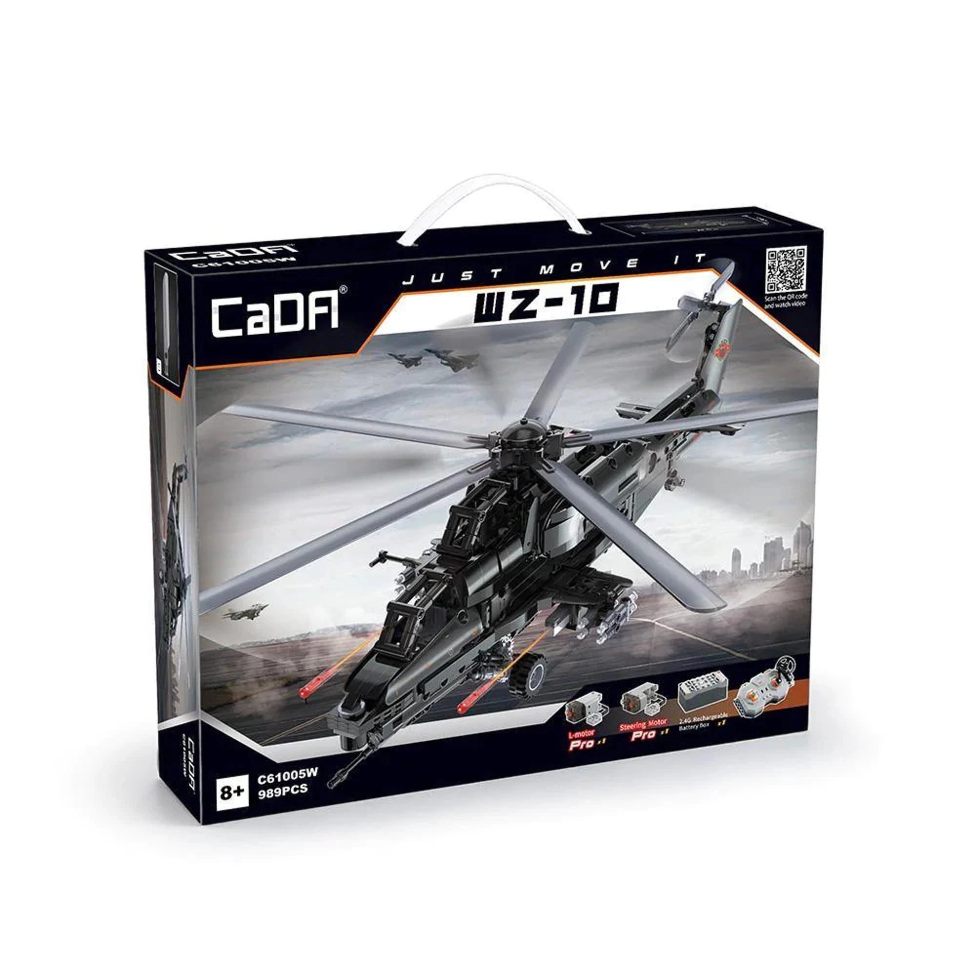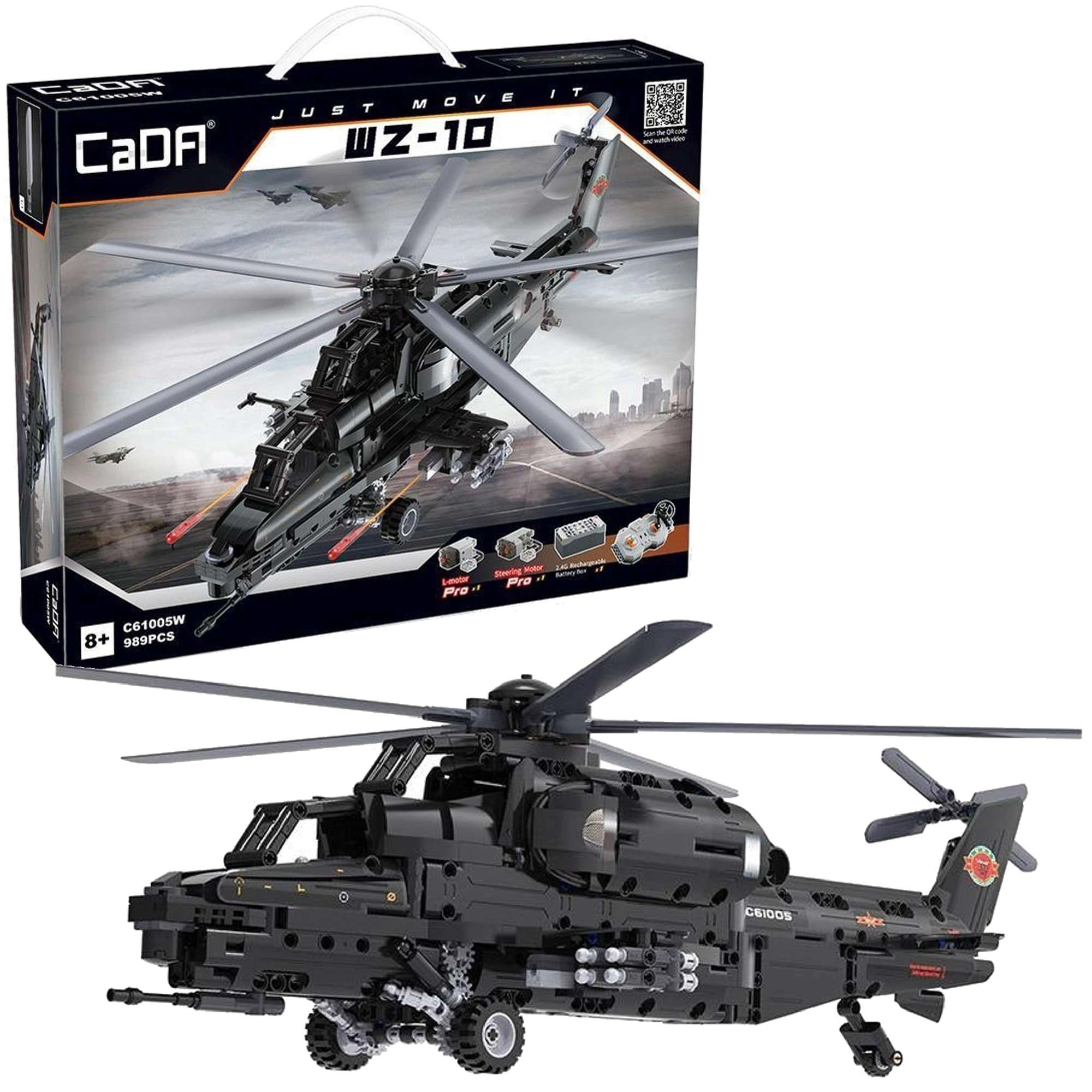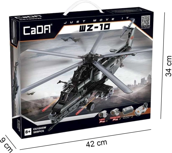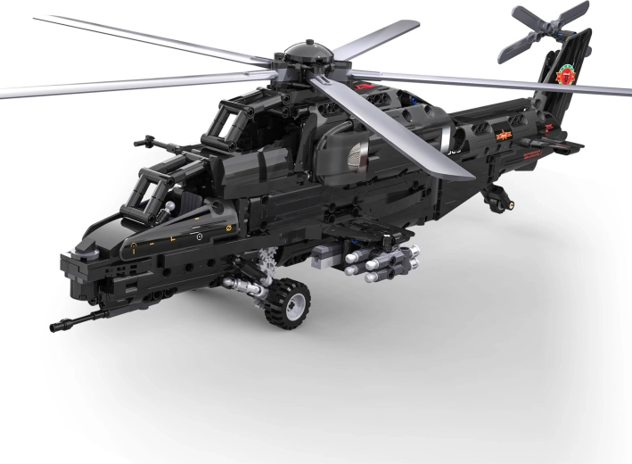 Bouw de iconische aanvalshelicopter WZ-10 met 989 onderdelen van CaDA en bedien hem op afstand. Het model biedt een werkende hoofd- en staartrotor, een openende cockpit, een functionele raketlanceerder en beweging op wieltjes. Dankzij de RC-besturing op 2,4 GHz met een bereik van meer dan 25 m geniet je van volop actie en nauwkeurig technisch bouwen.