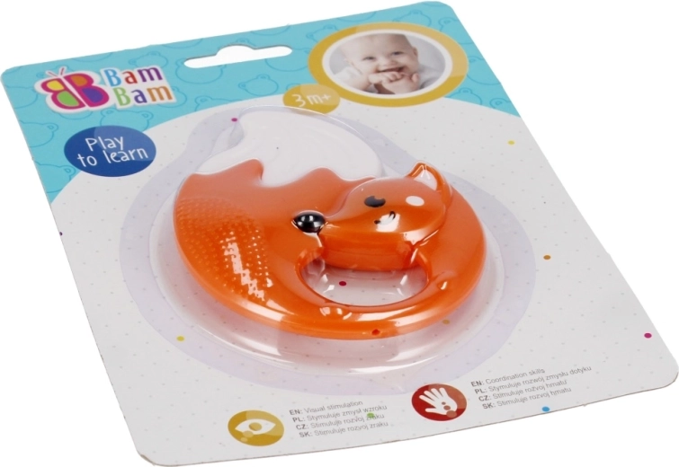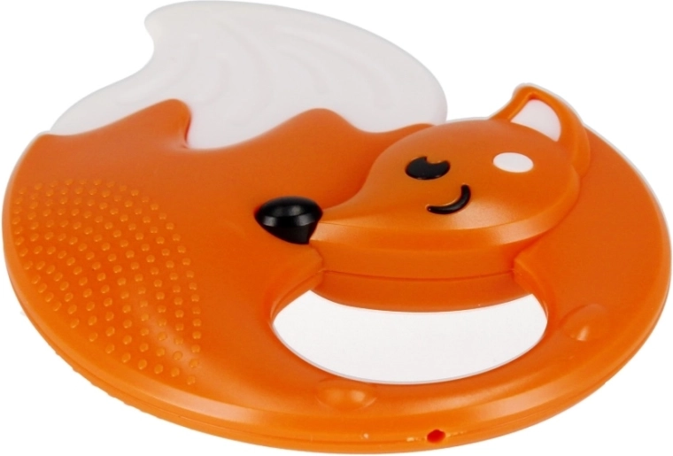 Schattige babyrammelaar en bijtring in de vorm van een vos, ideaal voor baby’s vanaf 3 maanden. De ergonomische ring maakt vasthouden met kleine handjes eenvoudig en getextureerde oppervlakken masseren het tandvlees zacht. Lichtgewicht constructie, contrasterende kleuren en geluidstimuli ondersteunen de ontwikkeling van zicht, gehoor en fijne motoriek.