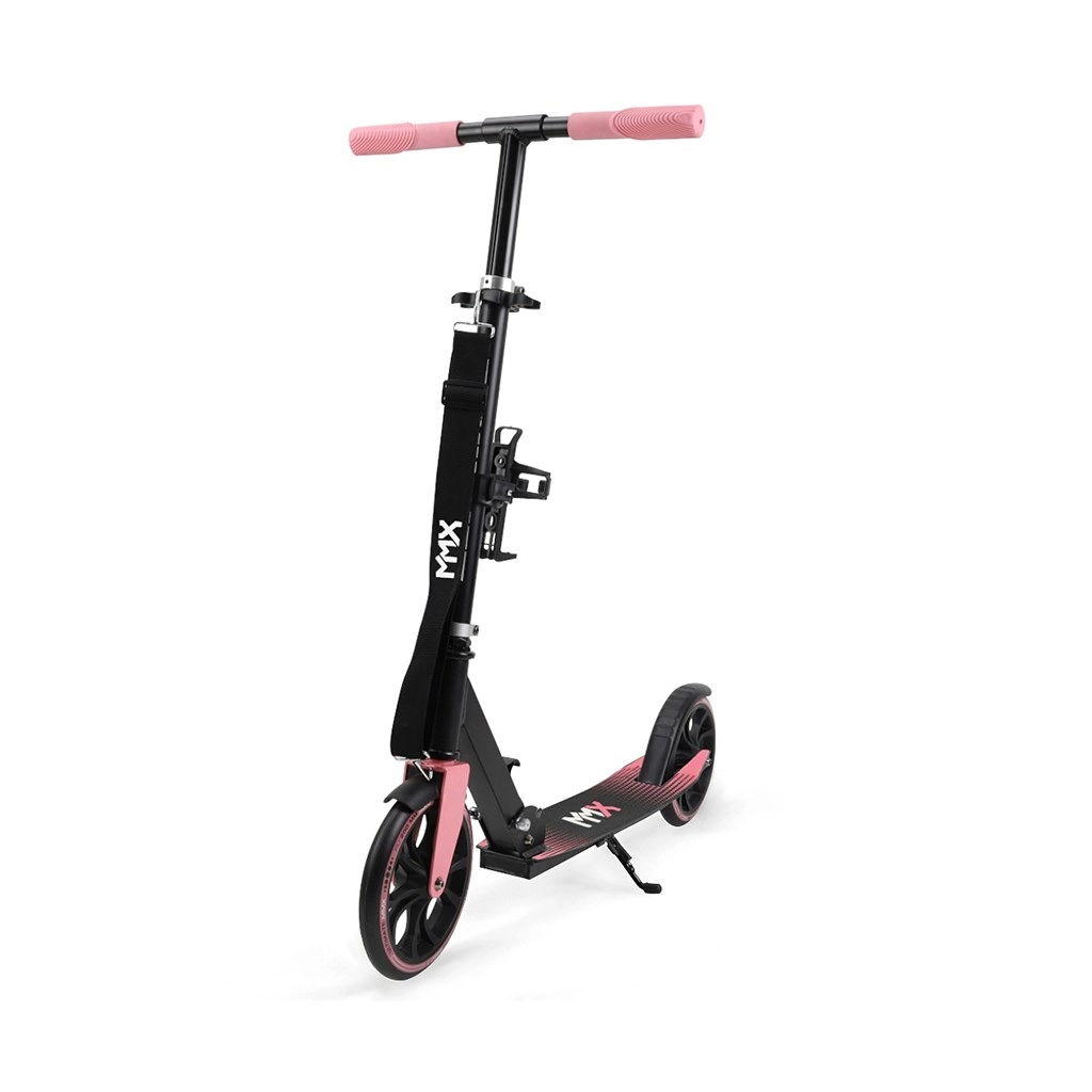 - standaard voor gemakkelijk parkeren, fleshouder en draagriem met MMX-logo