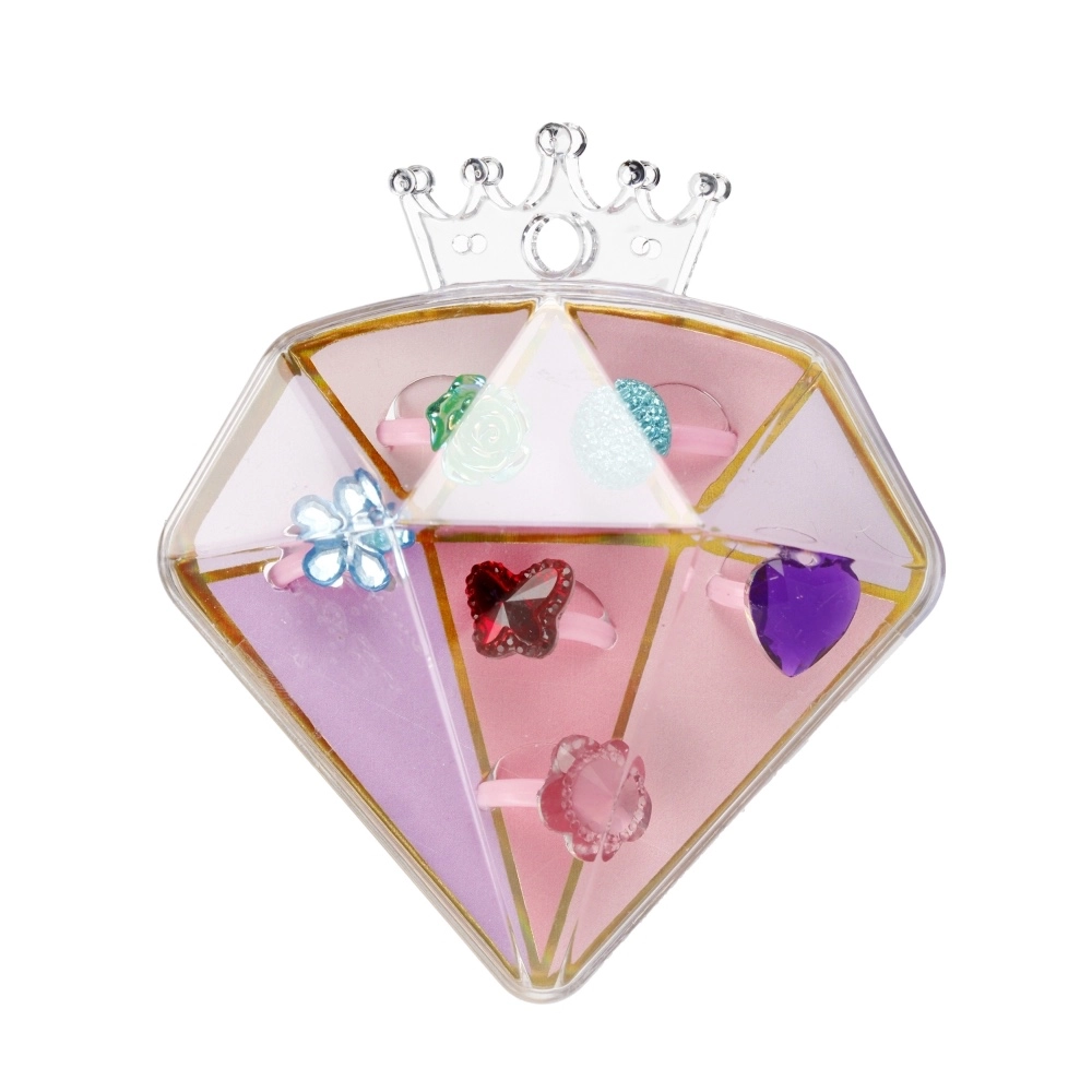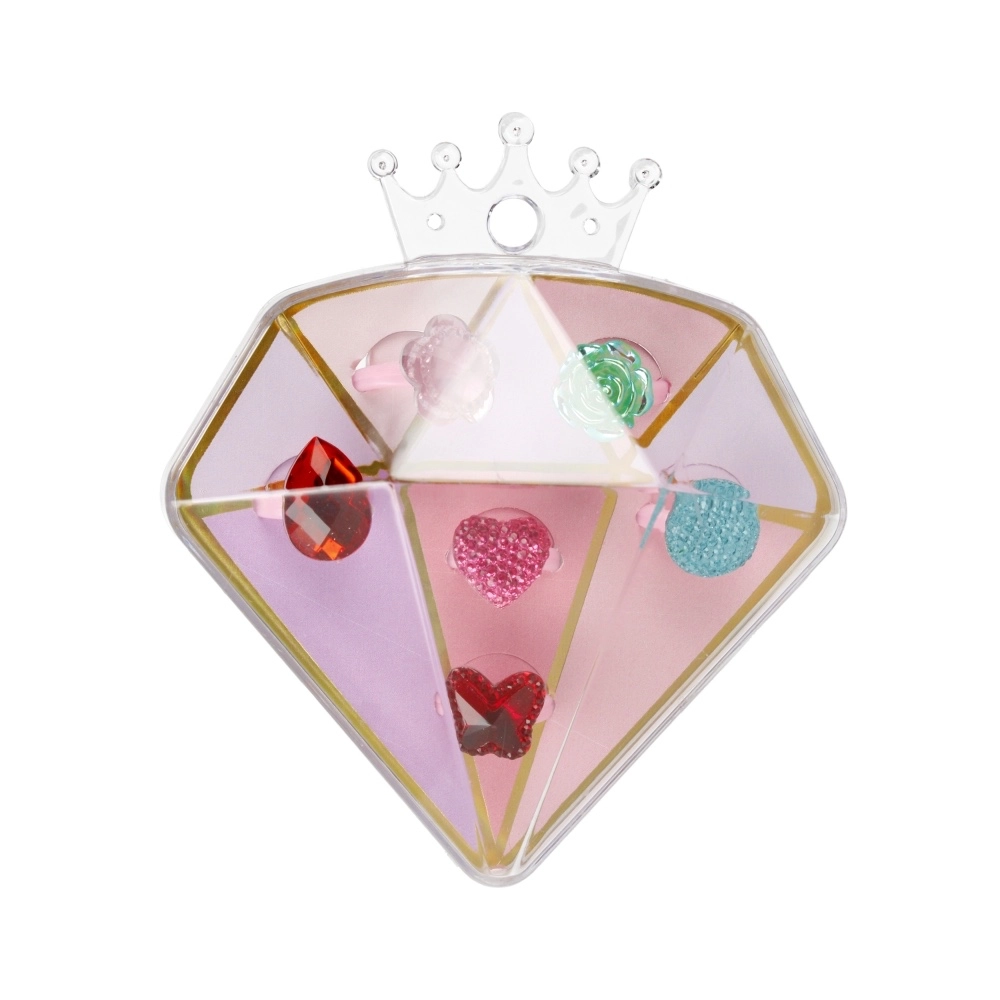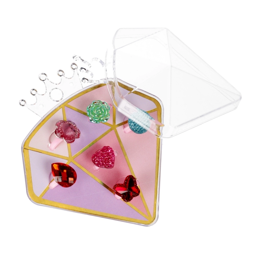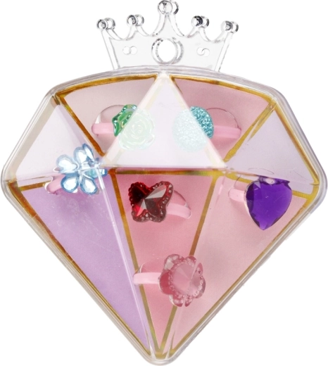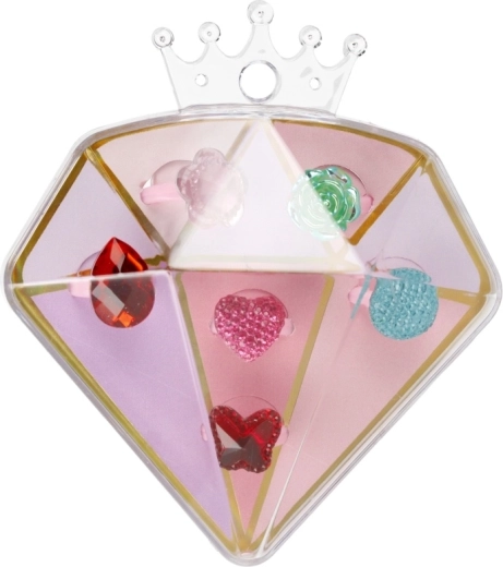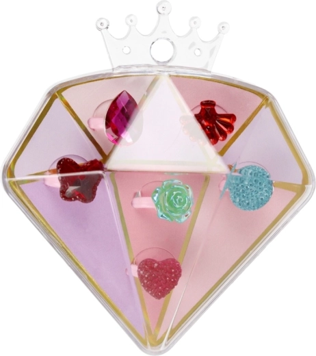 Geef kinderen plezier in verkleden en fantaseren met deze stijlvolle set ringen in een elegant doosje in diamantvorm. Elke ring heeft een ander motief (hartjes, bloemetjes, steentjes) en een vrolijke kleur, zodat kinderen makkelijk de juiste voor elke dag kiezen.