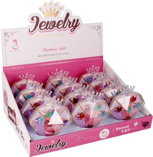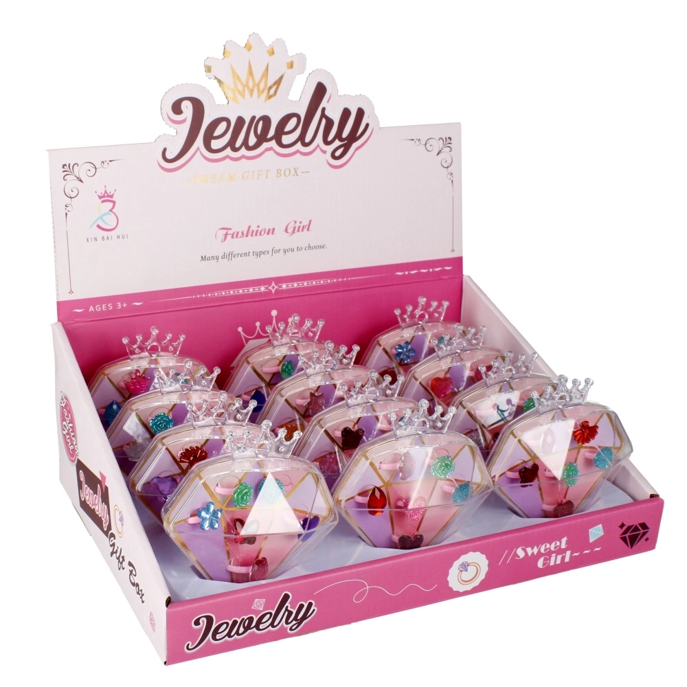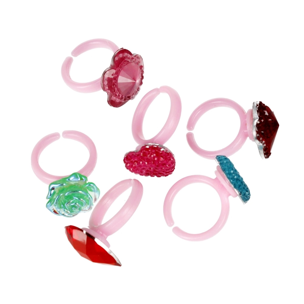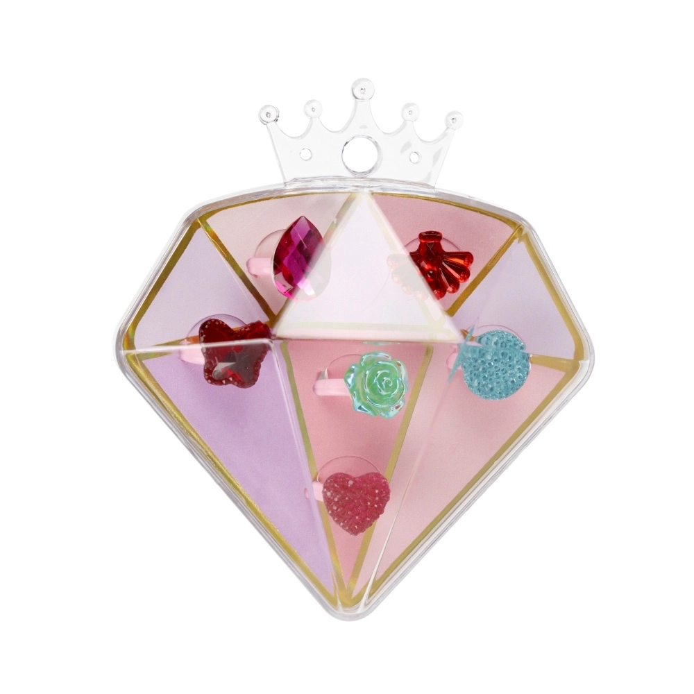 Geef kinderen plezier in verkleden en fantaseren met deze stijlvolle set ringen in een elegant doosje in diamantvorm. Elke ring heeft een ander motief (hartjes, bloemetjes, steentjes) en een vrolijke kleur, zodat kinderen makkelijk de juiste voor elke dag kiezen.
