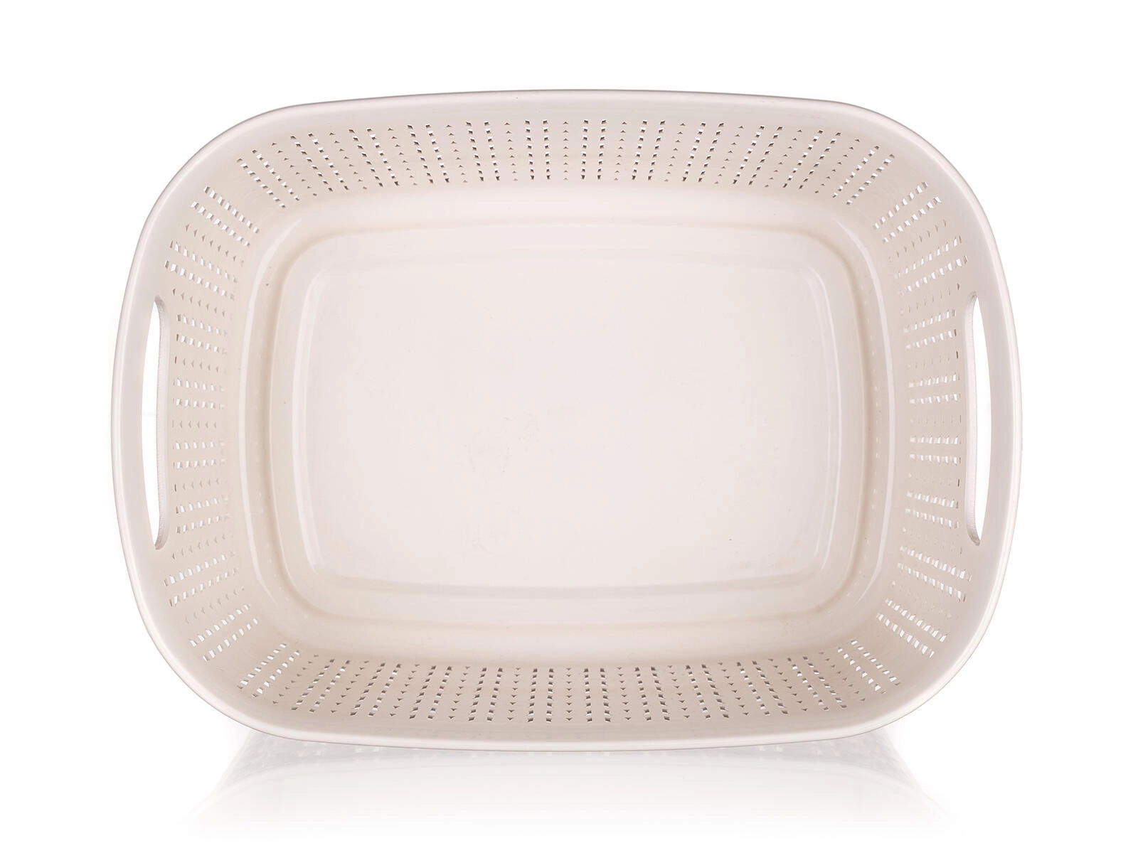 Praktisch kunststof mandje met rieten uitstraling en een inhoud van 3 l, ideaal voor het organiseren van kleine spullen in huis. Dankzij de compacte afmetingen van 26,5 × 20 × 9,5 cm past het in planken en lades, en de crèmekleur laat zich gemakkelijk combineren met elk interieur. Duurzaam kunststof garandeert een lange levensduur en eenvoudig onderhoud.