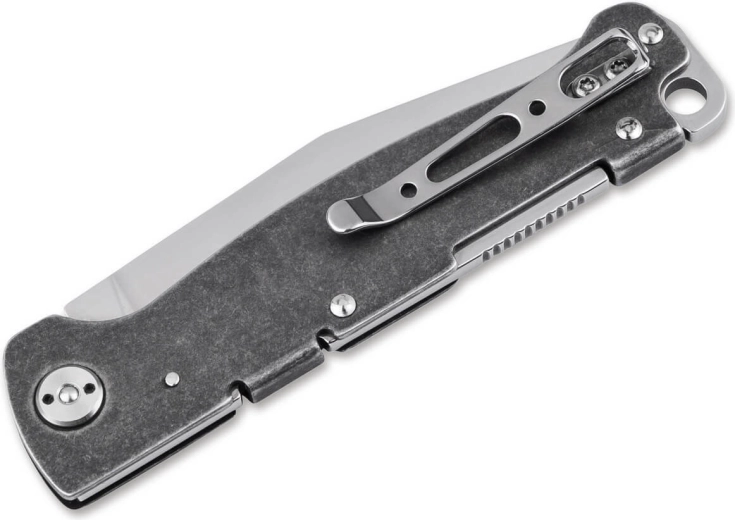 Compact en betrouwbaar zakmes voor dagelijks gebruik met een Clip Point lemmet van duurzame D2 staalsoort, een zeker backlock vergrendeling en een stalen handgreep met donkere stonewash afwerking. Praktische clip en koordoog zorgen voor comfortabel EDC-gebruik.