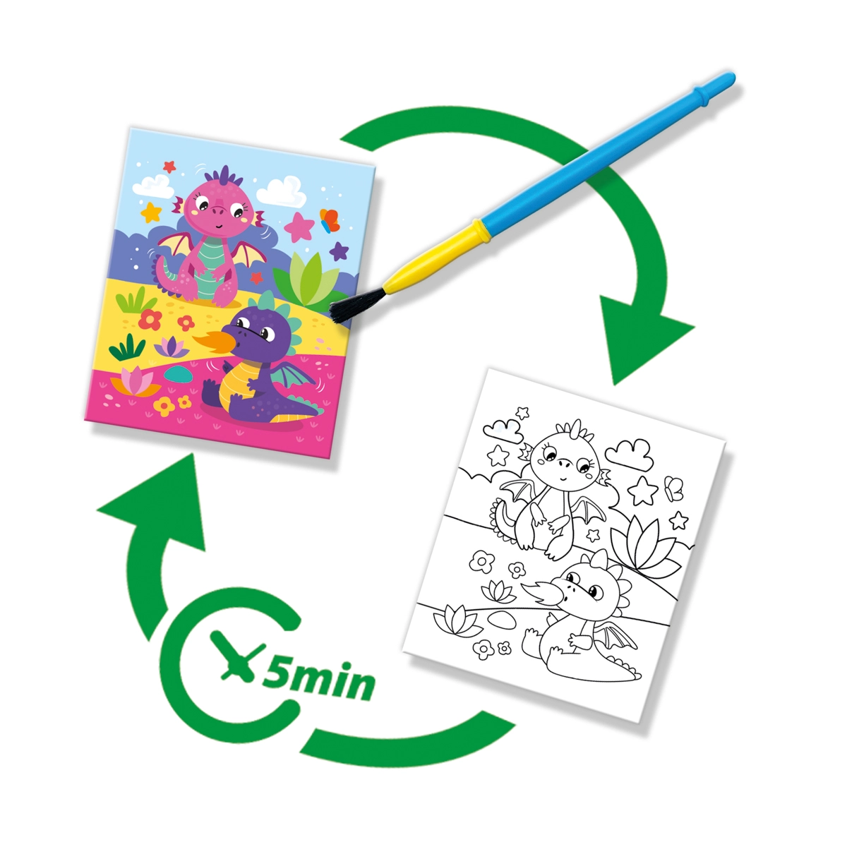 Maak van de creatieve tijd van kinderen puur plezier. De set “Schilderen met water – Fantasy” laat kinderen vanaf 3 jaar schilderen met alleen water – zonder verf, zonder vlekken en zonder opruimen. Na bevochtigen lichten de afbeeldingen op in kleur en na het drogen verdwijnen ze weer, zodat kinderen keer op keer kunnen blijven schilderen.