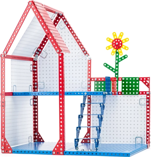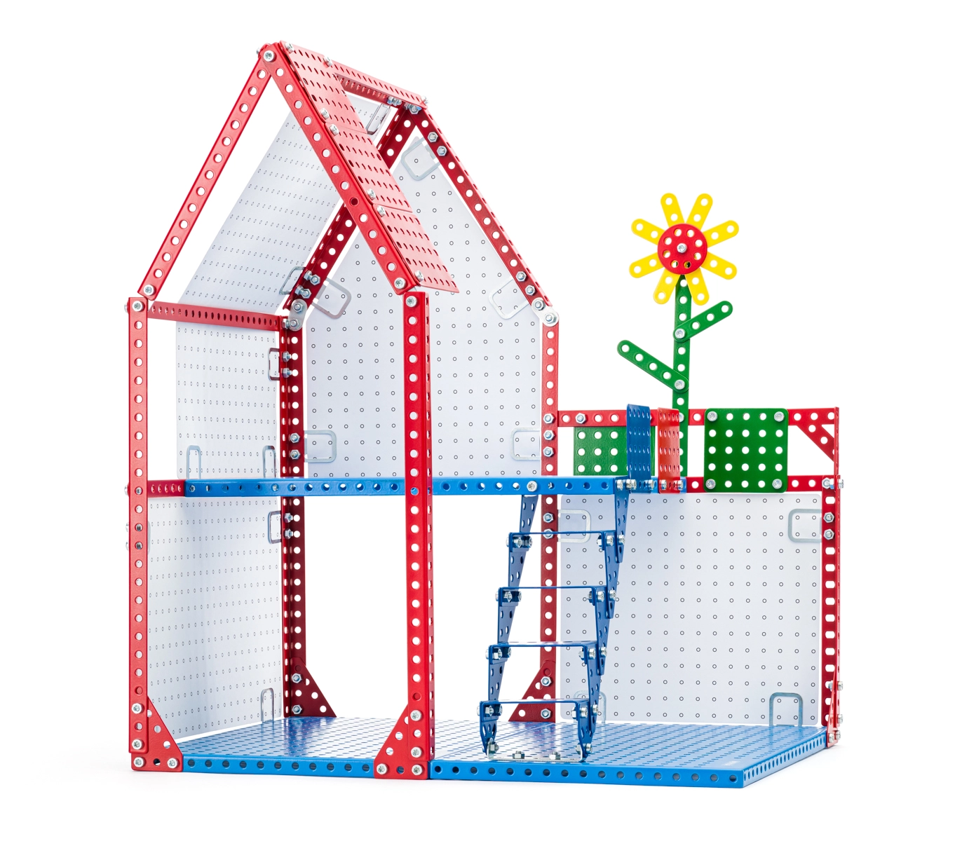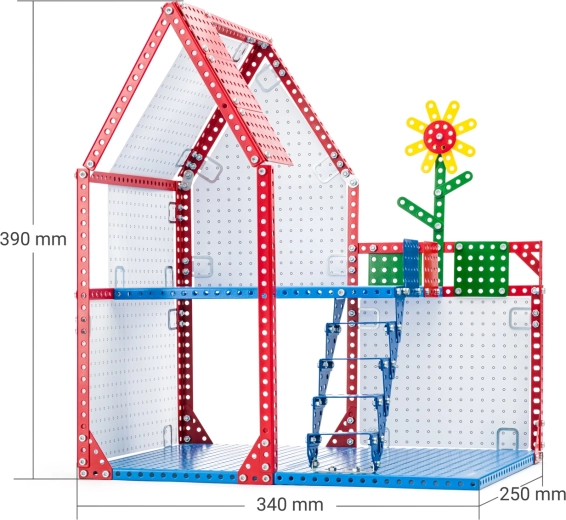 Bouw voor kinderen een realistisch tweelaags poppenhuis uit de legendarische Tsjechische MERKUR-bouwset. Metalen onderdelen worden eenvoudig verbonden met schroefjes en moertjes, zodat jonge bouwers hun handigheid, ruimtelijk inzicht en technische vaardigheden oefenen. Het voltooide model biedt een trap naar de tweede verdieping en acht wanddelen die kinderen zelf kunnen beschilderen.