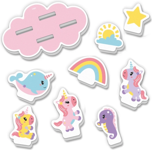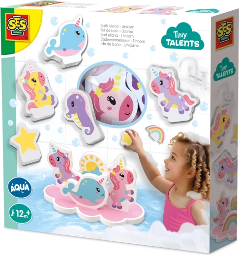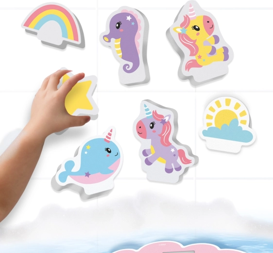 Ontdek het plezier van badderen met de Tiny Talents set – zachte, lichte en kleurrijke foamdelen met eenhoorns, een regenboog en een zonnetje. Kinderen pakken ze gemakkelijk vast, plakken ze op natte tegels en laten ze over het water drijven. Dankzij het drijvende “eiland” kunnen kleine handjes scènes en verhalen direct in het bad maken.