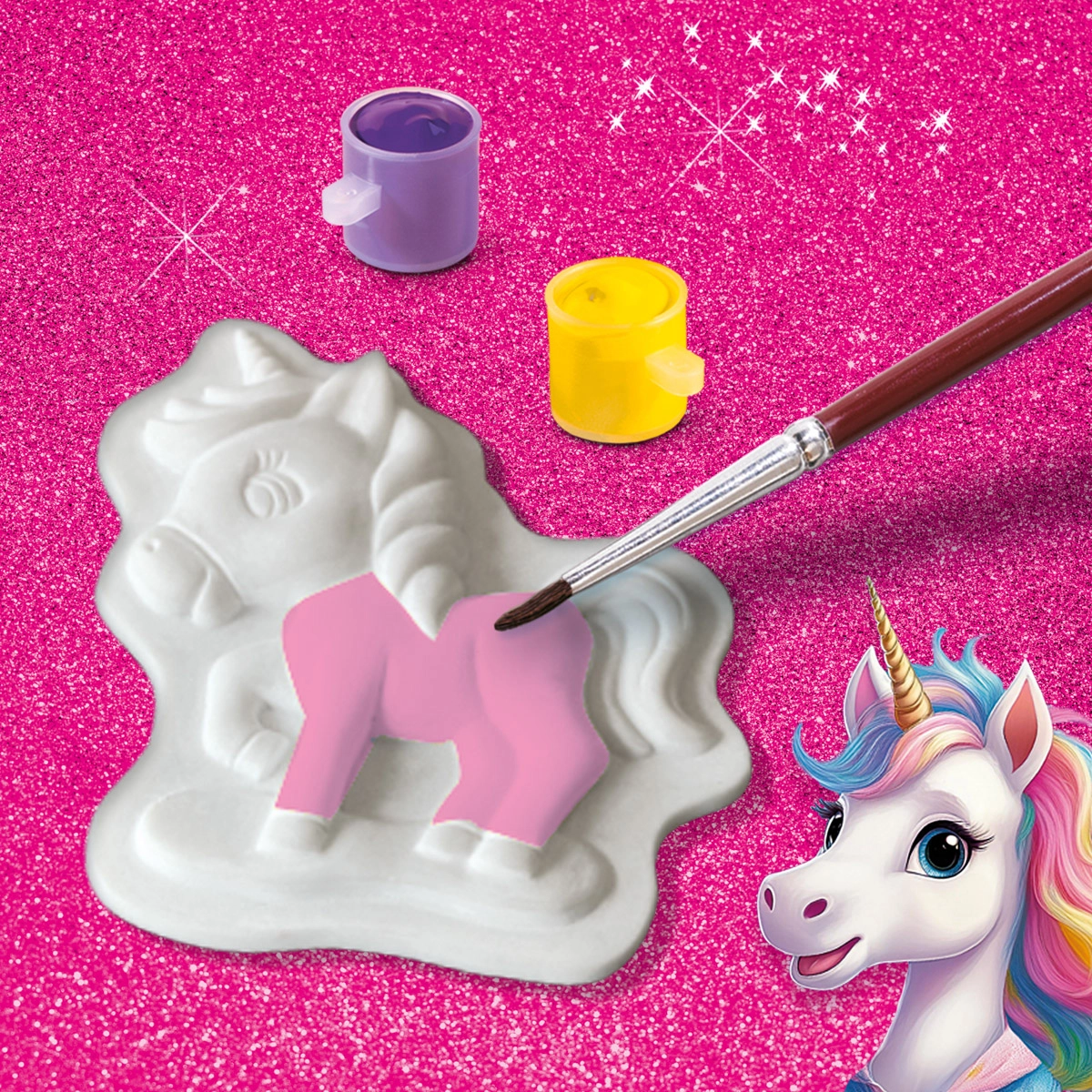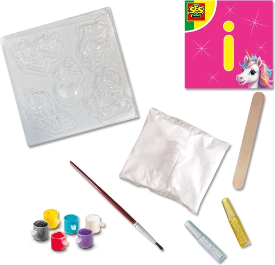 - Gietmal voor eenhoorns, 300 g gips, houten spateltje, 6 tinten plakkaatverf, gouden glitterlijm, zilveren glitterlijm, penseel, handleiding